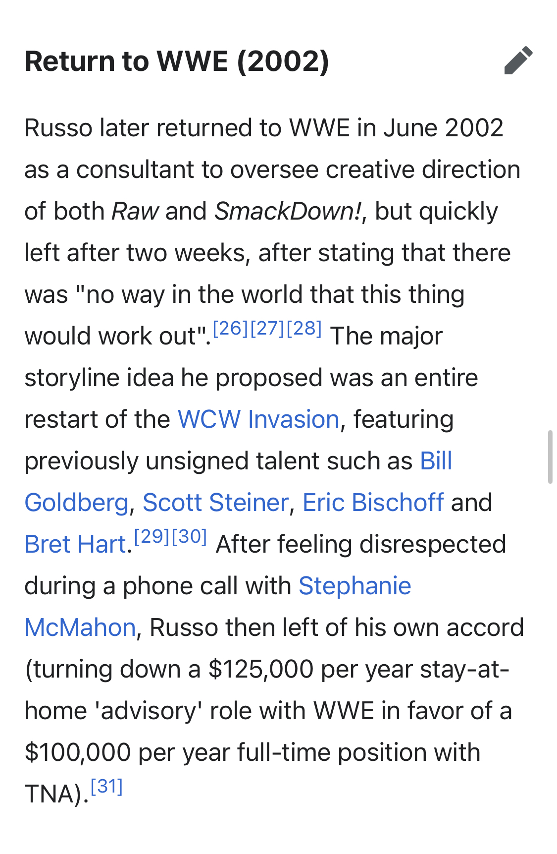 I have also noticed that Russo seems kinda pissed off at WWE and I'm not entirely sure why. wikipedia gives a possible answer though. he last worked for them in 2002, but it was only for two weeks and he left on bad terms. apparently they were going to make a second try at the invasion angle and they wanted russo to be involved in some way. my guess is that they wanted him to do some sort of humiliation ritual like they did with Bischoff and he wasn't willing to do it.