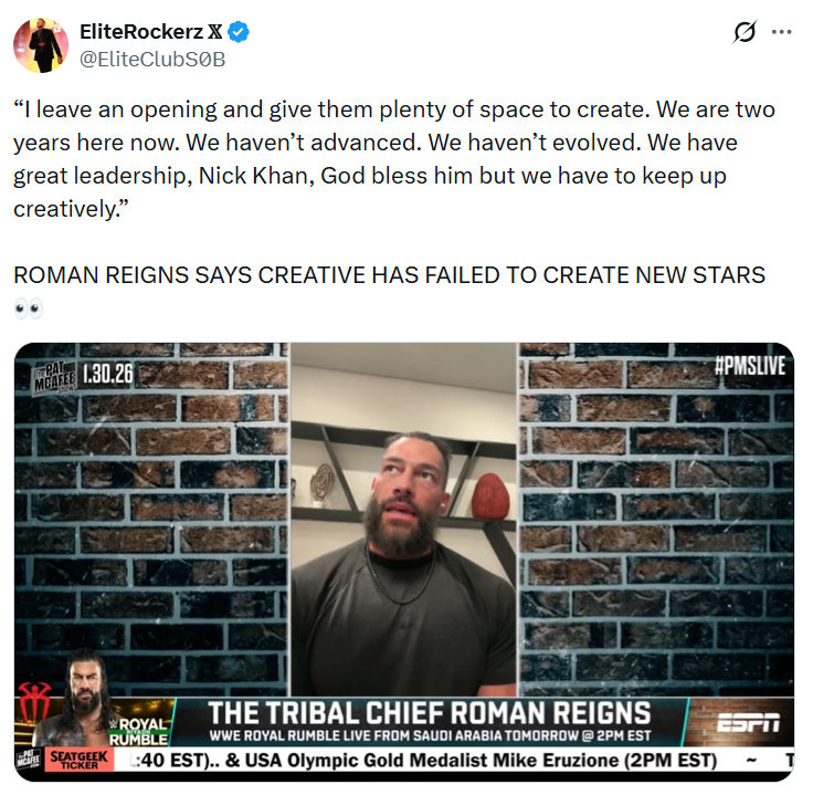>View on Competition: Reigns has stated that he doesn't "personally" see AEW as competition. He argues that AEW caters to a "hardcore" audience, which creates a natural ceiling for their viewership, whereas WWE focuses on "mainstream" and casual fans.>The "Little Brothers" Comment: In a 2021 interview, Reigns referred to the AEW roster as "little brothers," claiming he could throw almost the entire roster "out of the club no problem" due to his status as a "legitimate athlete".>Best Talent in the World: Reigns has repeatedly claimed that WWE possesses the "best talent in the world" from top to bottom, asserting that "nobody touches me in this business" and dismissing comparisons to other promotions' performers.>Response to Cody Rhodes: In recent years, including comments made in 2025 and early 2026, Reigns has poked fun at Cody Rhodes' AEW tenure, suggesting Rhodes "did absolutely nothing" there before returning to the "big leagues" of WWE.