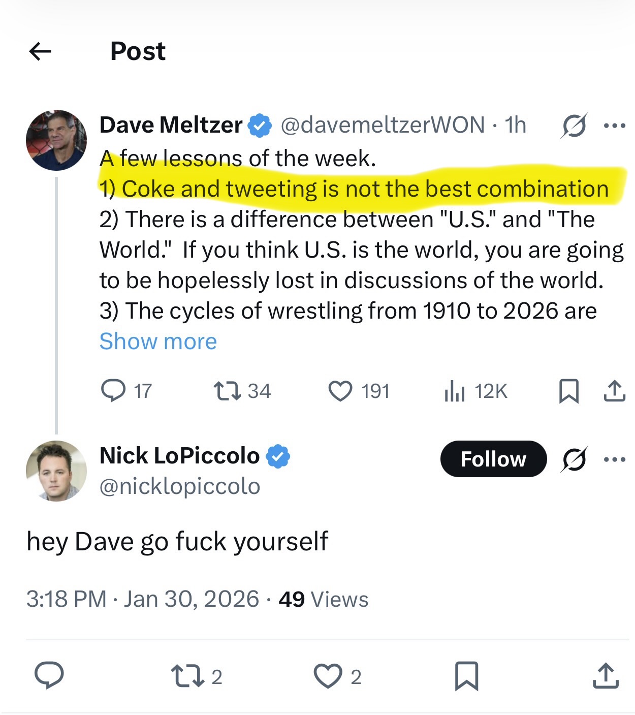 Also, you can really tell how many nerds are here including Meltzer because coke doesn't cause you to bingetweet