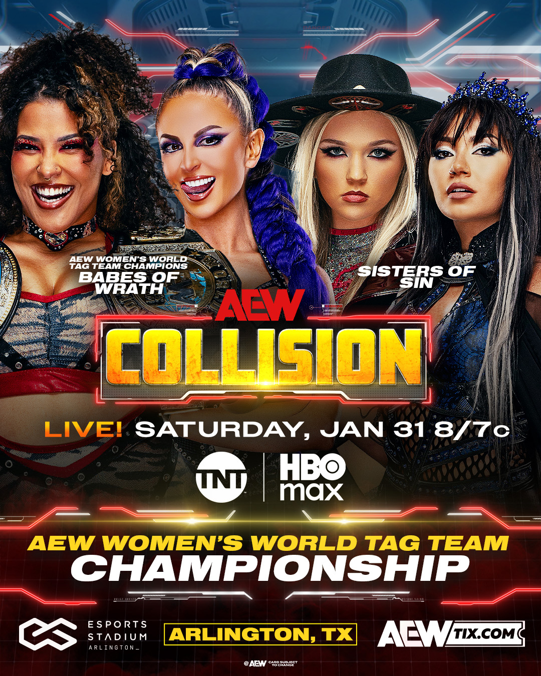 Collision Closes Out Its Esports Stadium Residency With A Night Of Title Bouts And In-Ring Debuts!...Saturday Night AEW Collision live TONIGHT! from The Esports Stadium in Arlington, TX8/7pm CT on TNT & HBO MAX!>Mark Briscoe (c) vs. Tommaso Ciampa for the TNT Championship>Babes Of Wrath (c) vs. Sisters Of Sin for the AEW Women's World Tag Team Championships>The Rainmaker Kazuchika Okada (c) vs. Adam Priest for the AEW International Championship>The Rascalz vs. Cru>Darby Allin vs. Clark Connors** 14 Days Out From Grand Slam Australia **** 43 Days Out From Revolution **