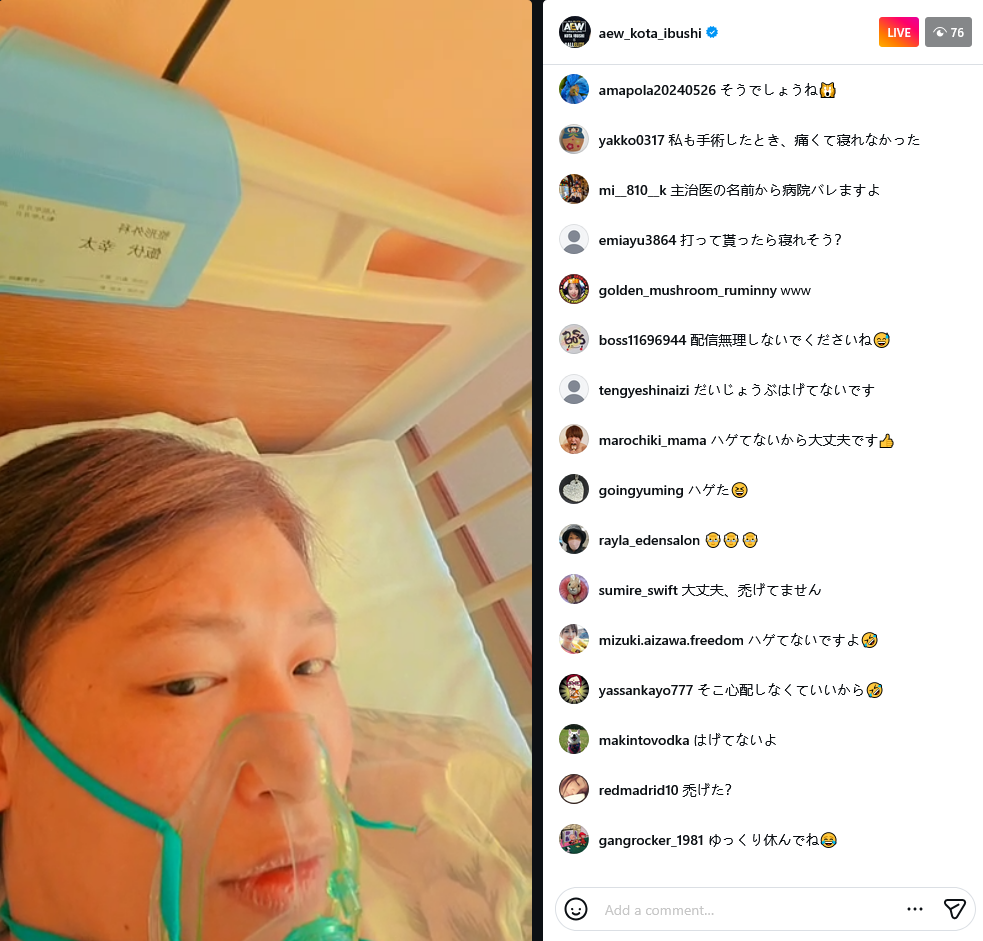 ibushi is live on instagram with an extremely surreal stream, laid up in a hospital bed, whispering into the camera, the only other noise being a machine he is plugged into that occasionally hisses