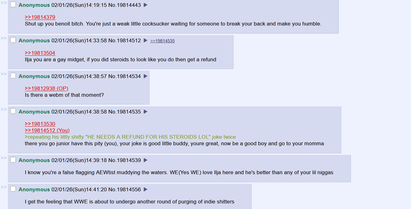 Shut up you benoit bitch. You're just a weak little cocksucker waiting for someone to break your back and make you humble.