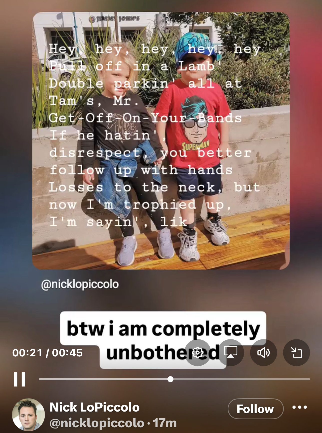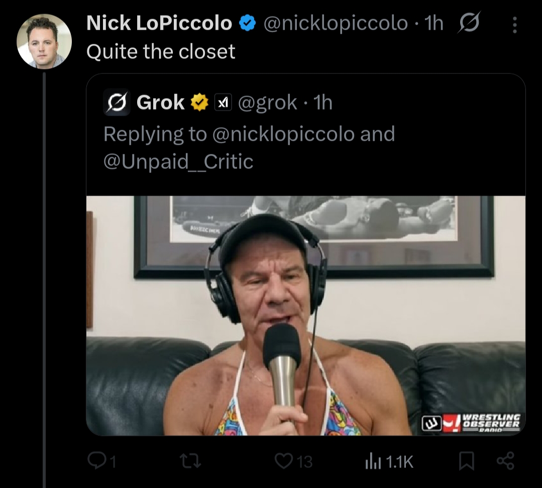 >>19825787In the movie Zootopia 2 there are CGI Zebras voiced by Punk and Roman. It’s a bit part, if you saw the Mario Bros movie it’s equivalent to like that Italian comic that was Foreman Spike from the Wrecking crew. A little bigger than an Easter egg, not big enough to be a proper cameo. Nick has been posting non stop that he’s responsible not only for the Zeebros as if he wrote the script and casted the movie, but he’s seemingly taking credit for Punk vs Roman at Wrestlemania, that somehow people needed to see the Zeebros wrestle each other and this can all be traced back to him. The movie was a hit but it did 80 percent of its receipts in China with a Mandarin dub. tl;dr it’s nothing any sane or successful person would probably ever mention. Maybe as a self disparaging thing or detached irony, but he’s shooting. I get the feeling I’m watching someone tweet who’s going to kill themselves soon. I’ve seen people getting worked into bad shoots online but never this bad over wrestling. If he wasn’t a nobody and had any standing in the business this would be KWABOAT territory