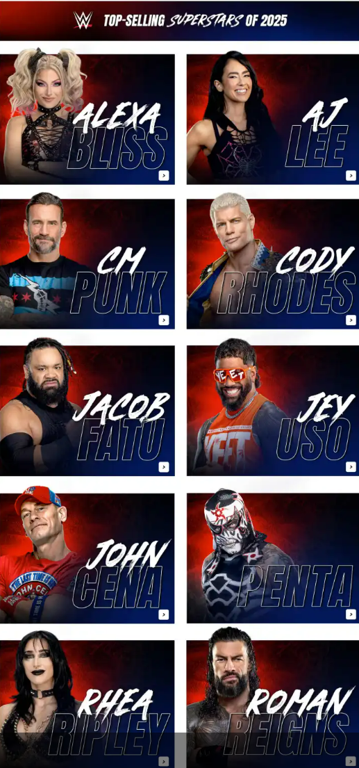 >>19828519It's incredibly hard to maintain the momentum of white-meat babyfaces in this current era of wrestling, especially coming out of a very hot WM40 angle. Even then, Cody is still a major merch mover (was a top merch seller in 2025 according to WWEShop image) and still has a very dedicated fanbase>>19828522>Kit WilsonLiteral meme theme song wrestler. There's nothing to fumble>Motor City Machine GunsThey had their tag title reign and have had big moments in high profile matches like the TLC match at SummerSlam>FenixThere's a million luchadores on the roster. You have to take turns showcasing them in an American company>FatuHe's in a high profile position right now and was showcased heavily in the main event scene before he got hurt.