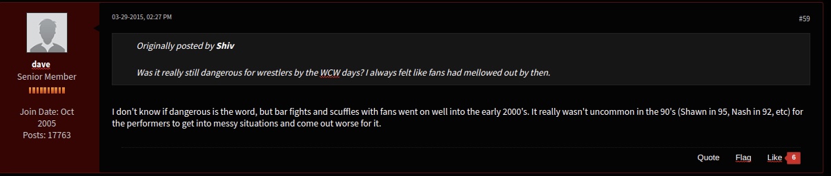 >>19834274>Nash in 92what the absolute fuck did he mean by this?Also its hilarious nonsense to think that guys trained to take damage for a living would have any issue with the average drunk fan. Ask DDP about how that goes. It is part of how he ended up in the business, watching wrestlers fuck people up at his bar.