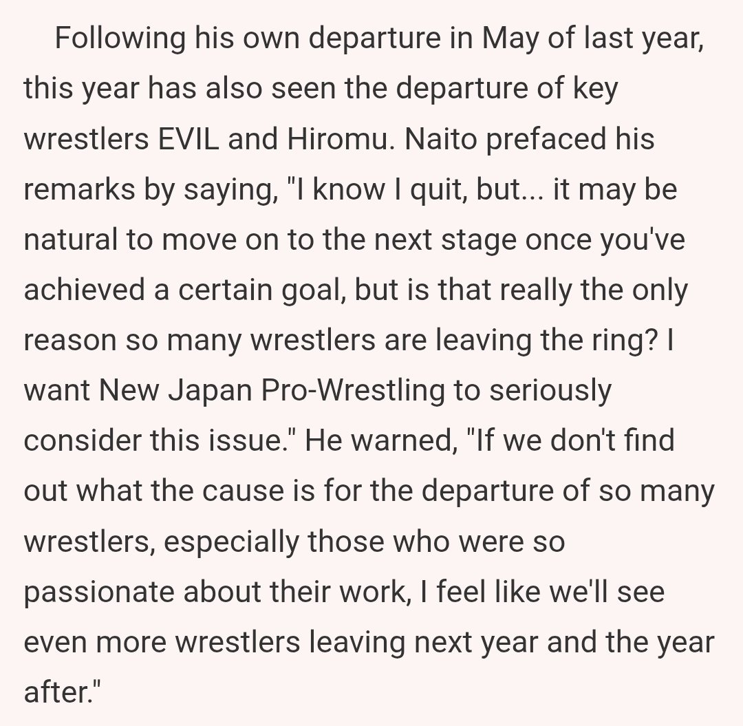 Truth is Naito got let go because he can't work anymore yet he wanted to keep his position at the top of the card AND wrestle less AND wrestle in a t-shirt AND he can't even fucking get up for Destinos anymoreNJPW will definitely be shedding more old men over the next couple of years and that's fucking based. It shows you why they're not like NOAH who does nothing but stink up their main events with old men.I'm glad I don't watch that slop and watch the promotion with the young heart that is full of potential. The future is bright for NJPW. For NOAH, the future is a cemetary.