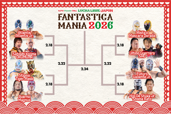 https://www.njpw1972.com/627464https://www.njpw1972.com/626994Fantasticamania cards are out.2/18 Yoyogi>Main event: Fantasticamania Tag Tournament First Round- Mascara Dorada & Mistico vs SHO & Ultimo Guerrero>6th Match: Match Relampago- Templario vs Soberano Jr.>5th Match: El Desperado, Ryusuke Taguchi, Master Wato & Masatora Yasuda vs Unbound Co. (Yota Tsuji, Titan, Taiji Ishimori & Daiki Nagai)>4th Match: Fantasticamania Tag Tournament 1st Round- Atlantis & Atlantis Jr. vs Satoshi Kojima & OKUMURA>3rd Match: Fantasticamania Tag Tournament 1st Round & Black Cat Memorial- Tiger Mask & Stigma vs Magnus & Averno>2nd Match: Match Relampago: Zane Jay vs Hechicero>1st Match: Fantasticamania Tag Tournament First Round- Valiente Jr. & Futuro vs Hijo De Stuka Jr. & Shoma Kato2/26>Mascara Dorada vs Hechicero>Averno vs Atlantis Jr.>Shoma Kato vs Titan2/27>Mistico vs Soberano Jr.>Templario vs Ultimo Guerrero>Shoma Kato vs AvernoShingo enters the tour