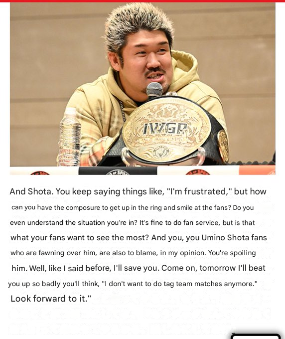 Shota needs to lean into the fact that he just inherently looks like an alcoholic rapist like his father, DEAN. Imagine DEAN trying to be all AISHITEMASUUUUU and shit. Wouldn't work. The Shooter thing is unironically the key to his success and despite being the most obvious path for him he doesn't take it. Just be NJPW DEAN nigga fucking hell.