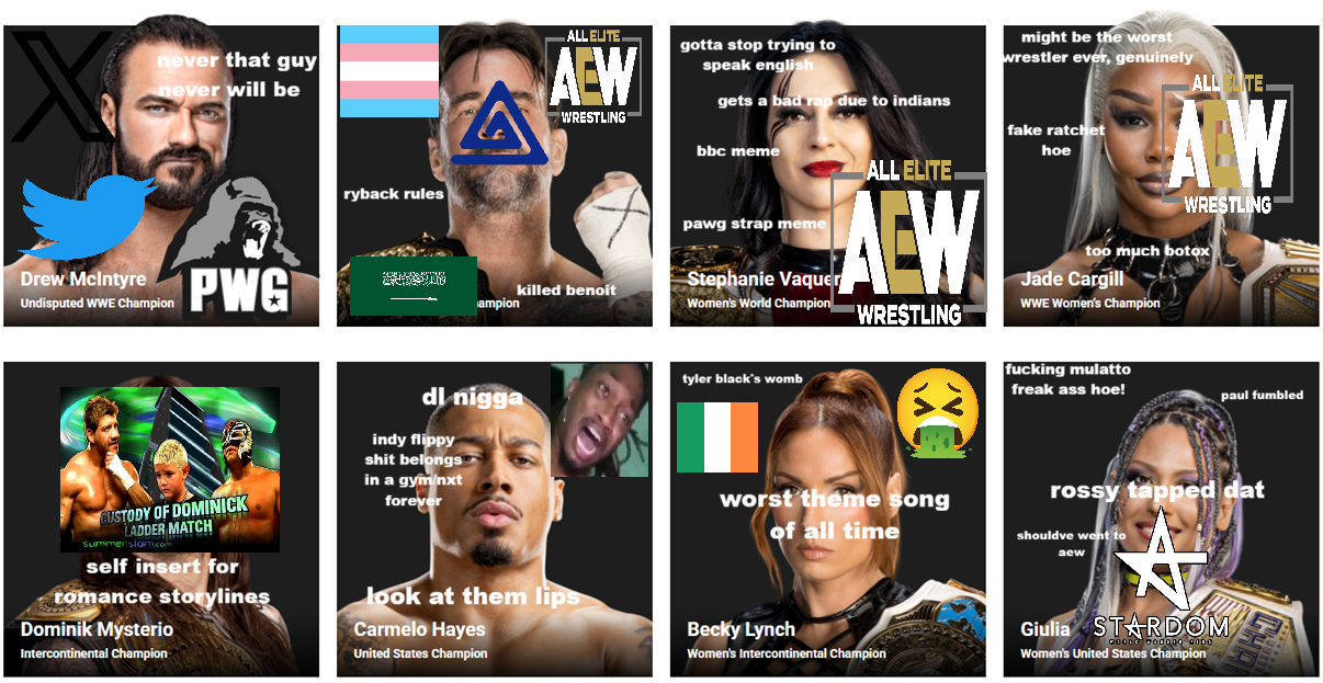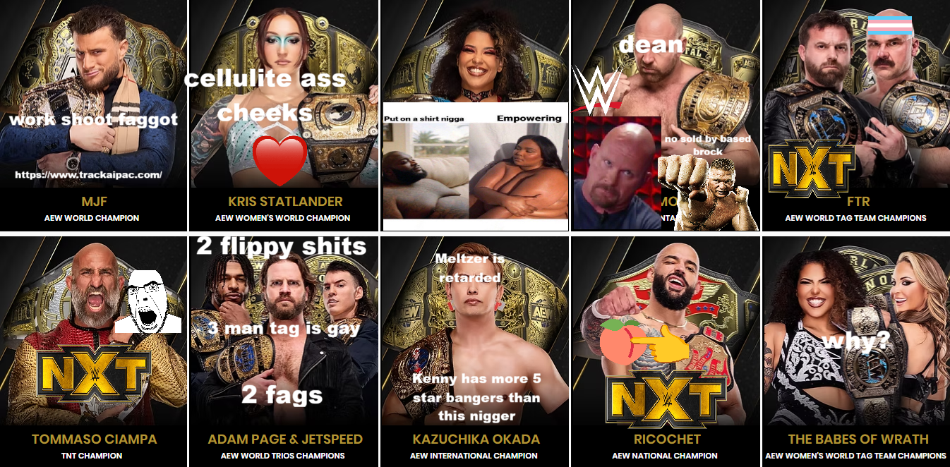 >>19840794>MJFShould be based but for some reason just isn't >StatlanderBased. >WillowSHE'S FAT. But not the worst AEW has. >Dean AmbroseGet this brain damaged retard away from wrestling>FTRStill based. >Ciampaidk... >Hangma'amAbsolutely fucking terrible. I hate his sad and confused fase. >OkadaPoor comedy jobber>RicochetDont give a fuck>Babes of WrathFunny enough to get a pass>>19840802>DrewBased. >PunkettyFaggot. >VaqIs actually good but can't speak English well enough to do a good promo. Has been booked shit. >JadeGet this awful bitch off my tv>DomBased>MeloMeh. >BeckyGood. I like Becky. >GiuliaJust horribly uninteresting