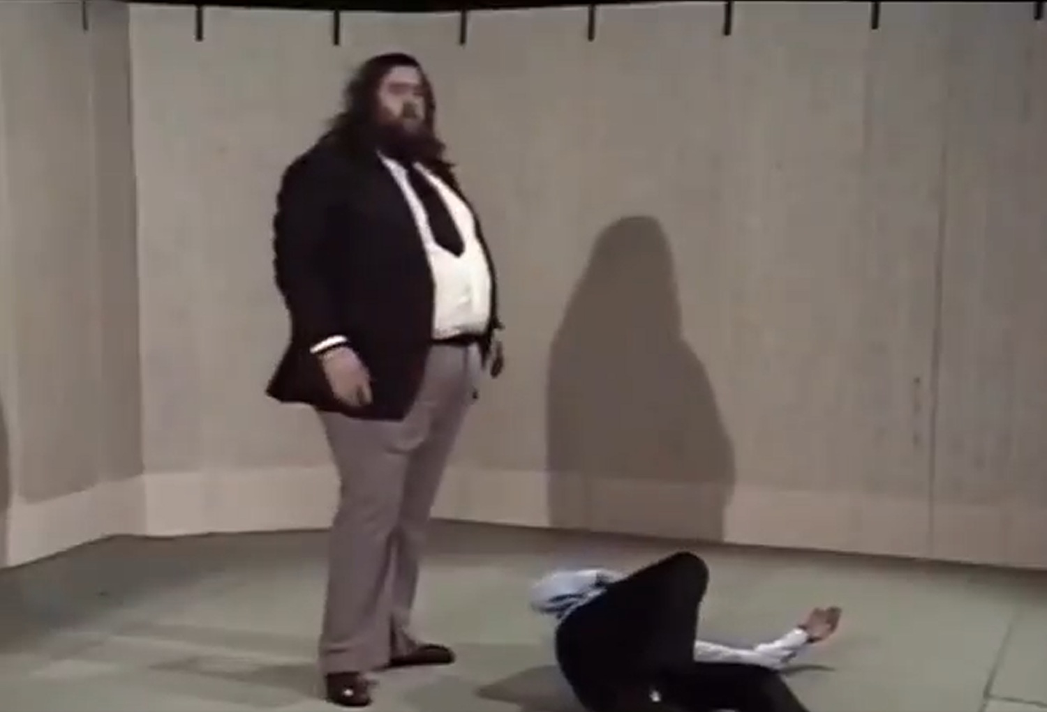 >Wrestler, who is over twice the size of the interviewer, takes offense to this and shoot bodyslams him breaking multiple ribs