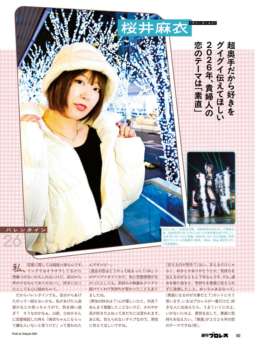 >When it comes to romance, I’m super passive. People might not imagine it because I act bold in the ring, but I could never start talking to someone myself, and even if I fall for someone, I keep it to myself. So even on Valentine’s Day, I don’t think I’ve ever been the one to give chocolate first. I end up thinking, “Would it be a bother if I gave it to them?” Am I overthinking it? Maybe. When I once asked Himeka-san for love advice, she said, “I don’t think anyone would be unhappy to get something from Mai-chan,” but still…>(How did your past relationships start?) The other person came on really strong. Even if I didn’t have romantic feelings at first, sometimes their feelings and enthusiasm reached me so strongly that my feelings changed.>(What kind of men do you like?) Someone kind-hearted. Appearance? I’ve never really paid attention, but my friends say I tend to like the fresh, clean-cut type. Also, I’m not the type who can act spoiled, so I’d like a guy who spoils me instead.>(You’re not good at being affectionate?) Yeah. Not just being affectionate—I’ve always been bad at expressing my feelings, like saying “I like you” or “thank you.” But looking back, there are so many times I regretted not being honest about my feelings.>(So being honest is important?) I really think so. Right now, pro wrestling comes first, but if I meet someone I like, whether it works out or not, I want to be brave and honestly tell them how I feel. “Honesty” is my love theme for 2026 (laughs).