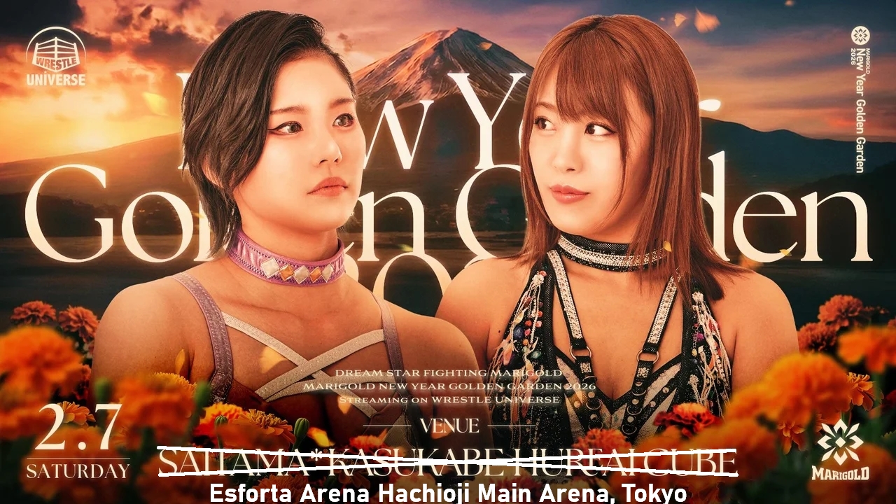 >MARIGOLD New Year Golden Garden2/7 Esforta Arena Hachioji (VOD 2/10 @ 7:00pm)2/8 Kasukabe Fureai Cube (VOD 2/11 @ 7:00pm) 2/13 Shinjuku FACE (Live @ 6:30pm) >3D Trios Title Tournament Semifinal: Mayu Iwatani, Victoria Yuzuki, & Komomo Minami vs Misa Matsui, Rea Seto, & Nagisa Nozaki>Miku Aono & Kouki Amarei vs Utami Hayshishita & Chika Goto>Mai Sakurai & Natsumi Showzuki vs Seri Yamaoka & Yuuka Yamazaki>Hummingbird vs CHIAKI>Nao Ishikawa vs Megaton>SYOKO Koshino vs Nagisa Tachibana2/14 Kariya Aioi Hall (6:00pm) (VOD 2/17 @ 6:00pm)>Mayu Iwatani, Victoria Yuzuki, & Komomo Minami vs Chika Goto, Kouki Amarei, & Hummingbird>Utami Hayashishita, Nao Ishikawa, & Nagisa Tachibana vs Mai Sakurai, Seri Yamaoka, & Shinno>Miku Aono & Megaton vs Misa Matsui & CHIAKI>Yuuka Yamazaki vs Nagisa Nozaki>Natsumi Showzuki vs SYOKO Koshino vs Rea Seto2/15 Osaka 176BOX (1:00pm) (VOD 2/18 @ 7:00pm) >3D Trios Title Tournament Semifinals: Mai Sakurai, Natsumi Showzuki, & Erina Yamanaka vs Seri Yamaoka, Yuuka Yamazaki, & SYOKO Koshino>Miku Aono, Kouki Amarei, & Shinno vs Utami Hayashishita, Chika Goto, & Nagisa Tachibana>Mayu Iwatani & Victoria Yuzuki vs Rea Seto & CHIAKI>Megaton vs Nagisa Nozaki>Hummingbird vs Misa Matsui>Nao Ishikawa vs Komomo Minami2/23 Korakuen (Live @ 11:30am)>3D Trios Title Tournament Final3/7 Naniwa Joshi @ MBS Chayamachi Plaza>Yuuka Yamazaki, Flying Penguin, Ryoko Sakimura>Socialshttps://dsf-marigold.comhttps://x.com/DSF_Marigoldhttps://x.com/Marigold_Joshihttps://x.com/hashtag/pw_mghttps://www.instagram.com/dsf_marigold/https://www.youtube.com/@MARIGOLD-ho5nzWatch on Wrestle Universe (¥1,298 per month)https://www.wrestle-universe.com/en/marigold>Entrance musichttps://youtube.com/playlist?list=OLAK5uy_mz1s3xkNlFsMmySZlRdsEkxjj2isTVUEsPrevious >>19852497