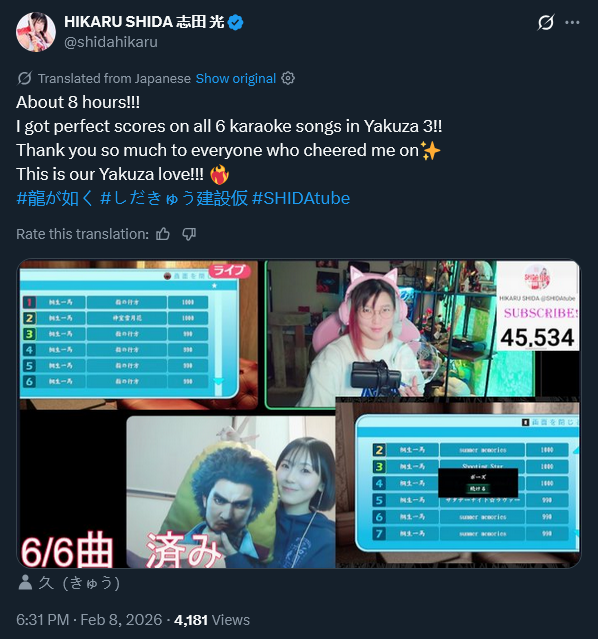 Recently she perfected all karaoke songs in Yakuza.