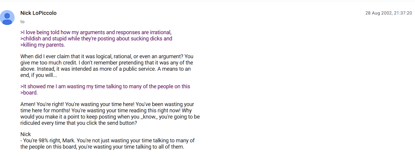 ITT: We try and piece together the details of Nick Lopiccolo's e-fed career. https://groups.google.com/g/rec.sport.pro-wrestling.fantasy/search?q=lopiccolo