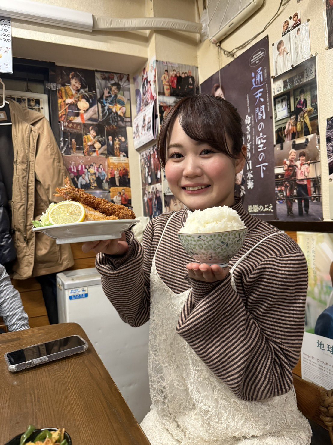 sharing a plate of tempura and some rice with kanae miku