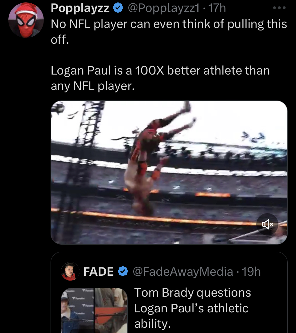 >>19874757Wrestling fans are huge retard who see flips/acrobatics and think that's all athleticism is and not strength/endurance/explosivenessFor example, prime Cena is a greater overall athlete than Ospreay, but this would shock the average mark into disbelief.