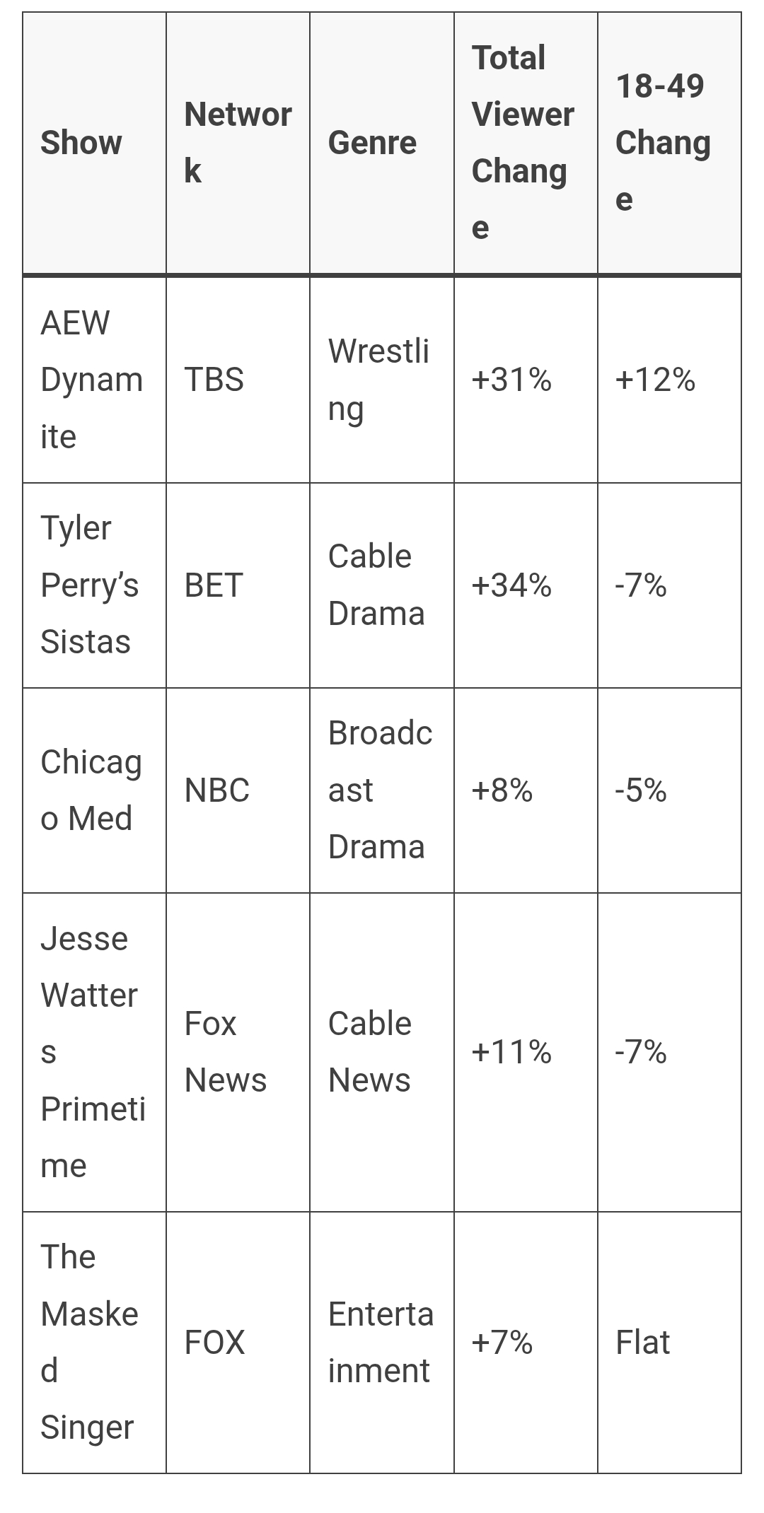 Okay but why is Dynamite the sole outlier that had a huge bump in total/demo? Other shows didn't come close to that.