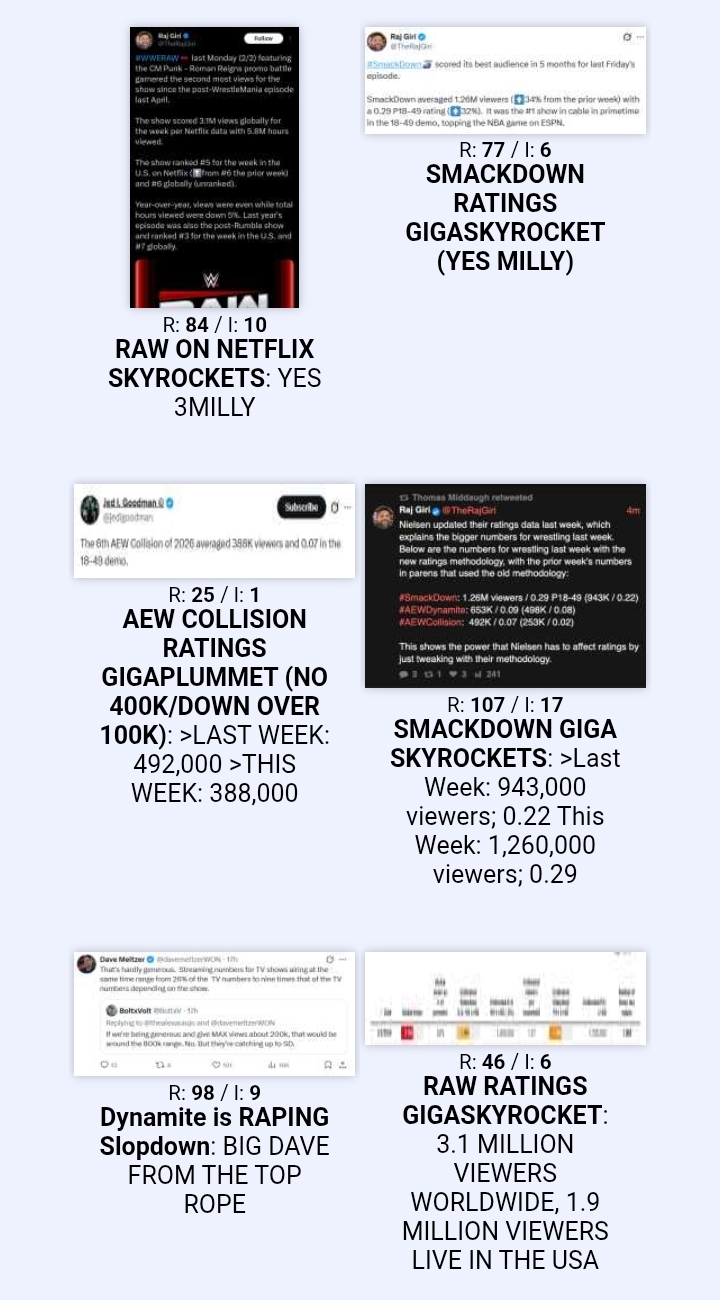 >>19878591I don't have a gimmick. I post in Raw and PPV gamethreads. I don't watch any other wrestling shows to post in their gamethreads. I post about Liv Morgan if the thread is about her, or she's related to the discussion.Everyone who posts about about Liv Morgan, Seth Rollins, Bron Breakker, Cody Rhodes, Roman Reigns, El Grande Americano, Iyo Sky, AEW, or WWE is not the same person. You are mentally ill, and why this board sucks.