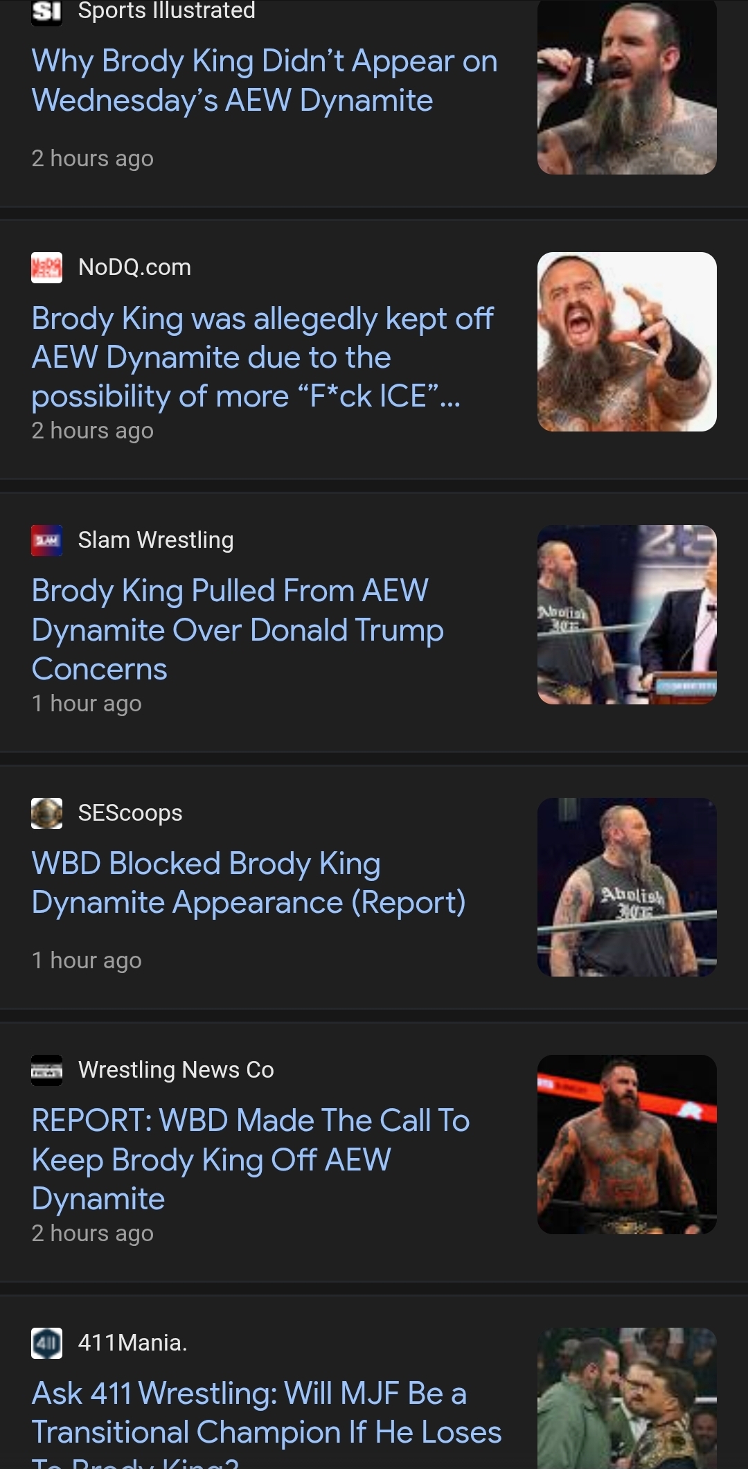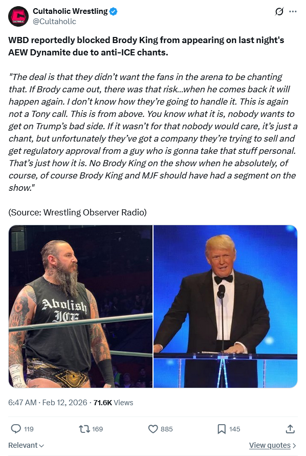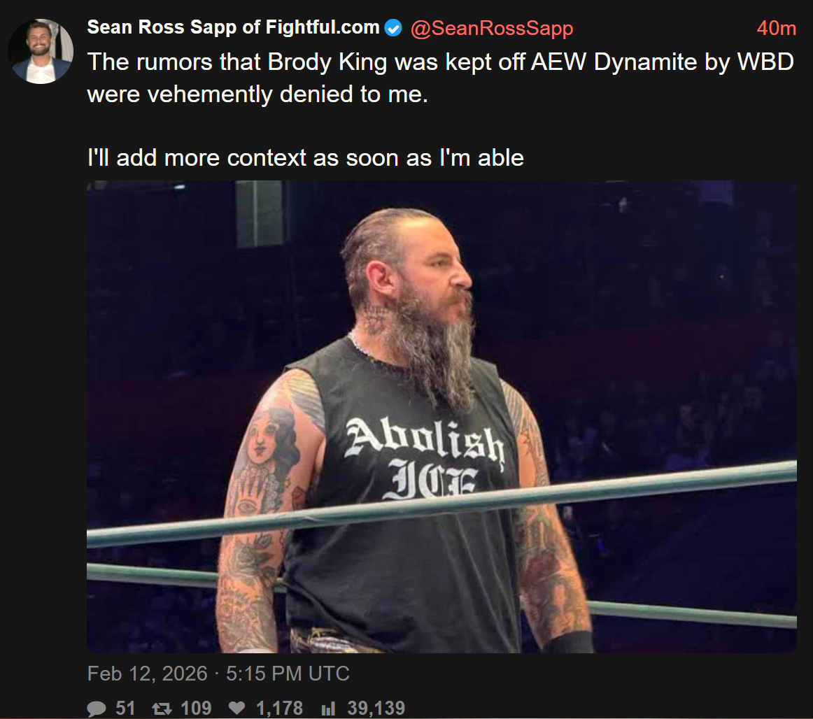 >Official statement to Fightful from WBD on Brody King:>"Warner Bros. Discovery did not have any involvement in Brody King’s upcoming AEW schedule. Any speculation to the contrary is categorically false. Brody is scheduled to appear during the next AEW event, which will air this Saturday on TNT and HBO Max"