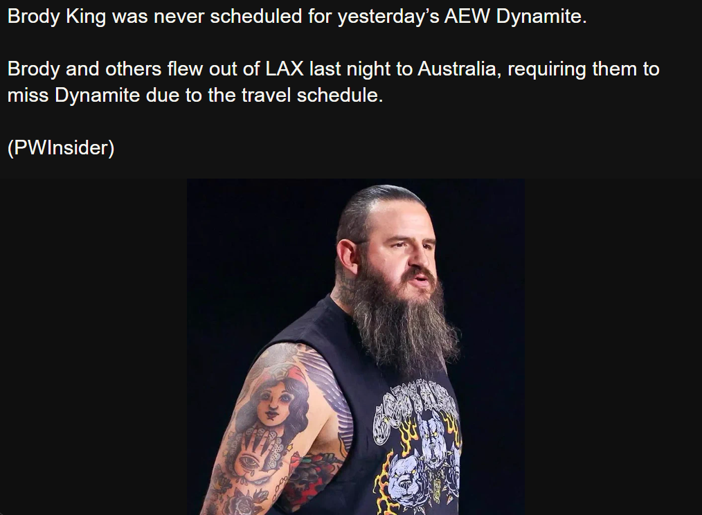 >>19879716>Brody King was never scheduled for yesterday’s AEW Dynamite. >Brody and others flew out of LAX last night to Australia, requiring them to miss Dynamite due to the travel schedule.>(PWInsider)