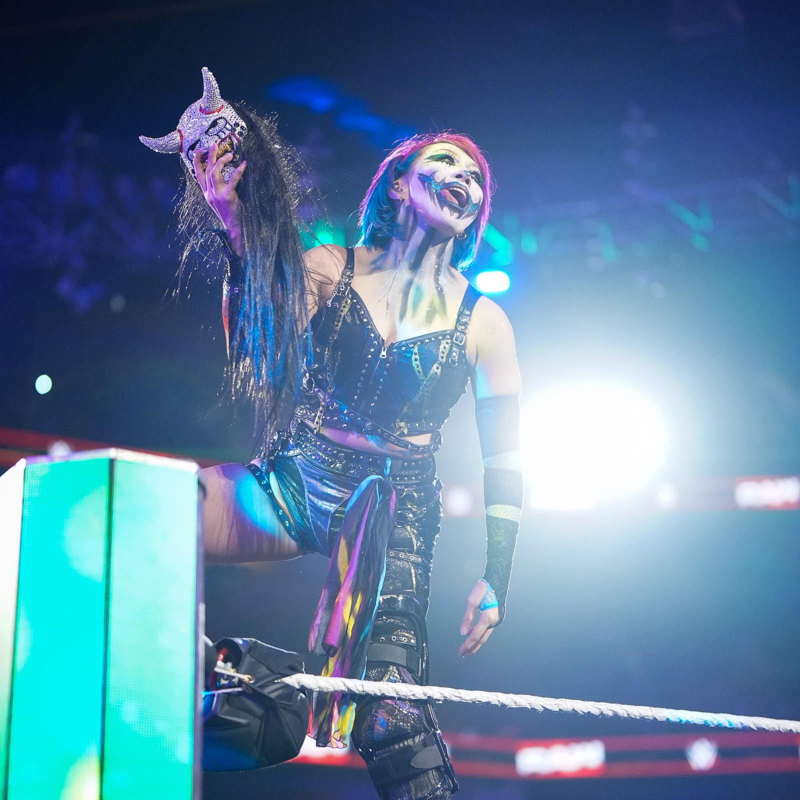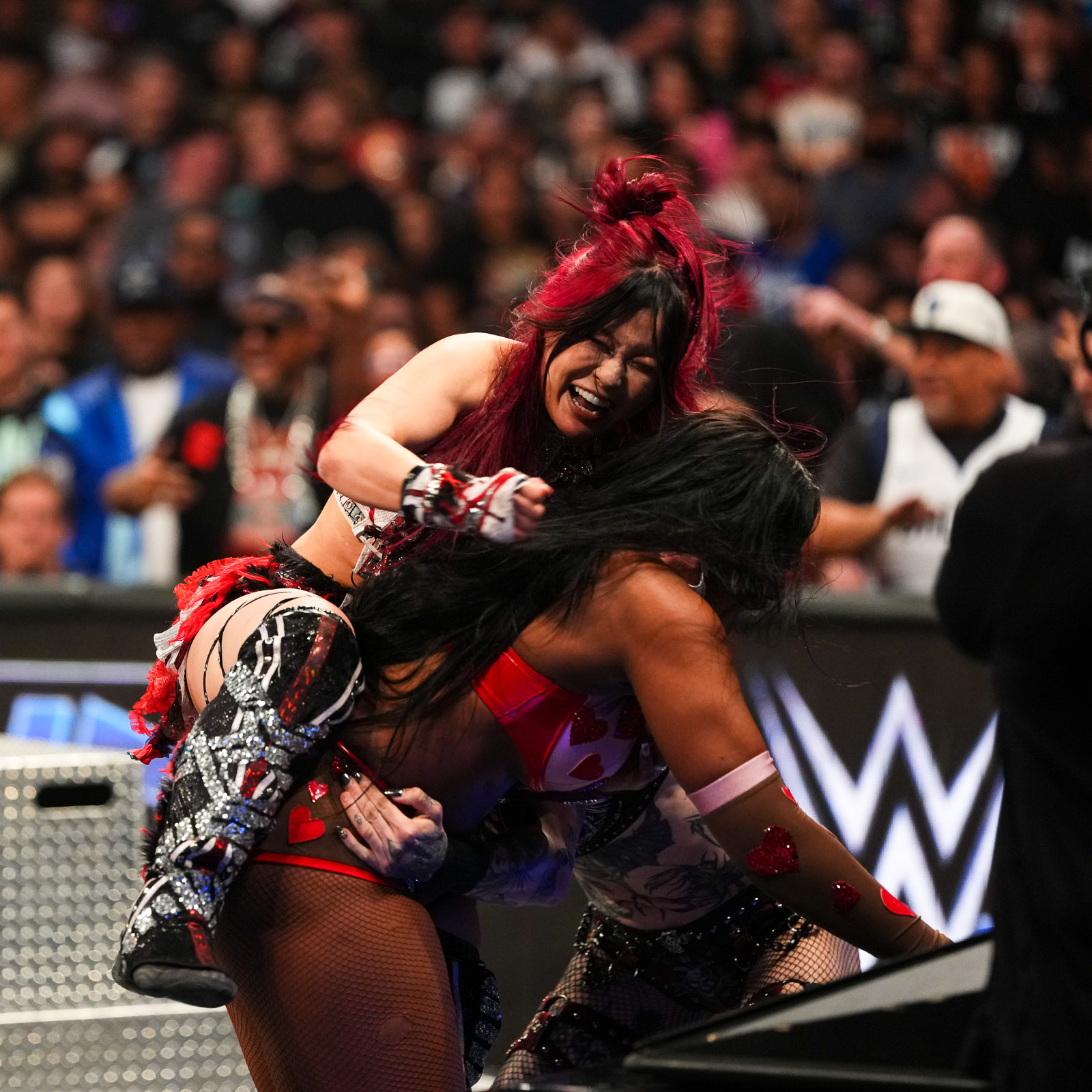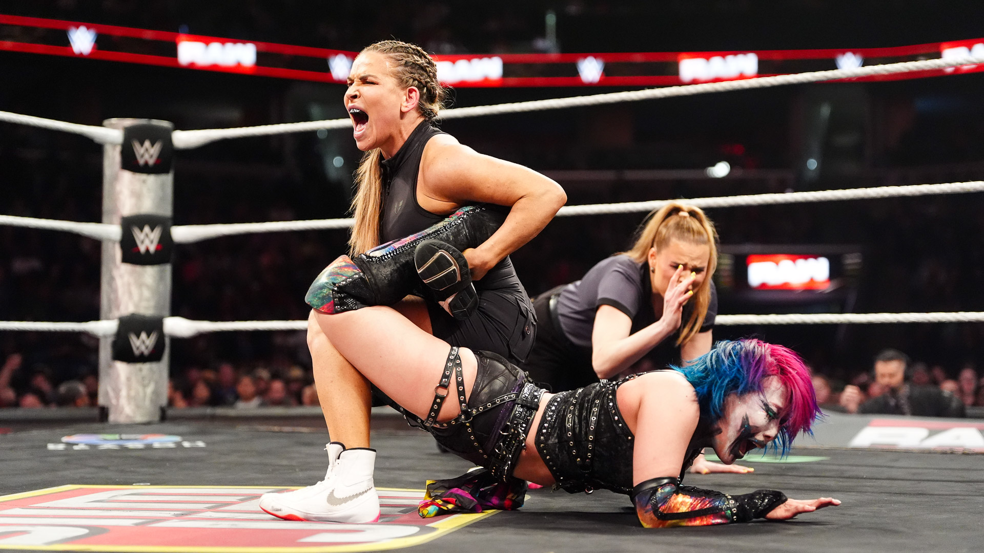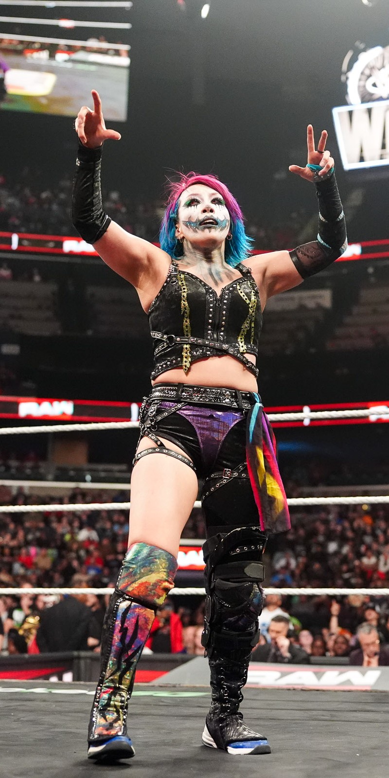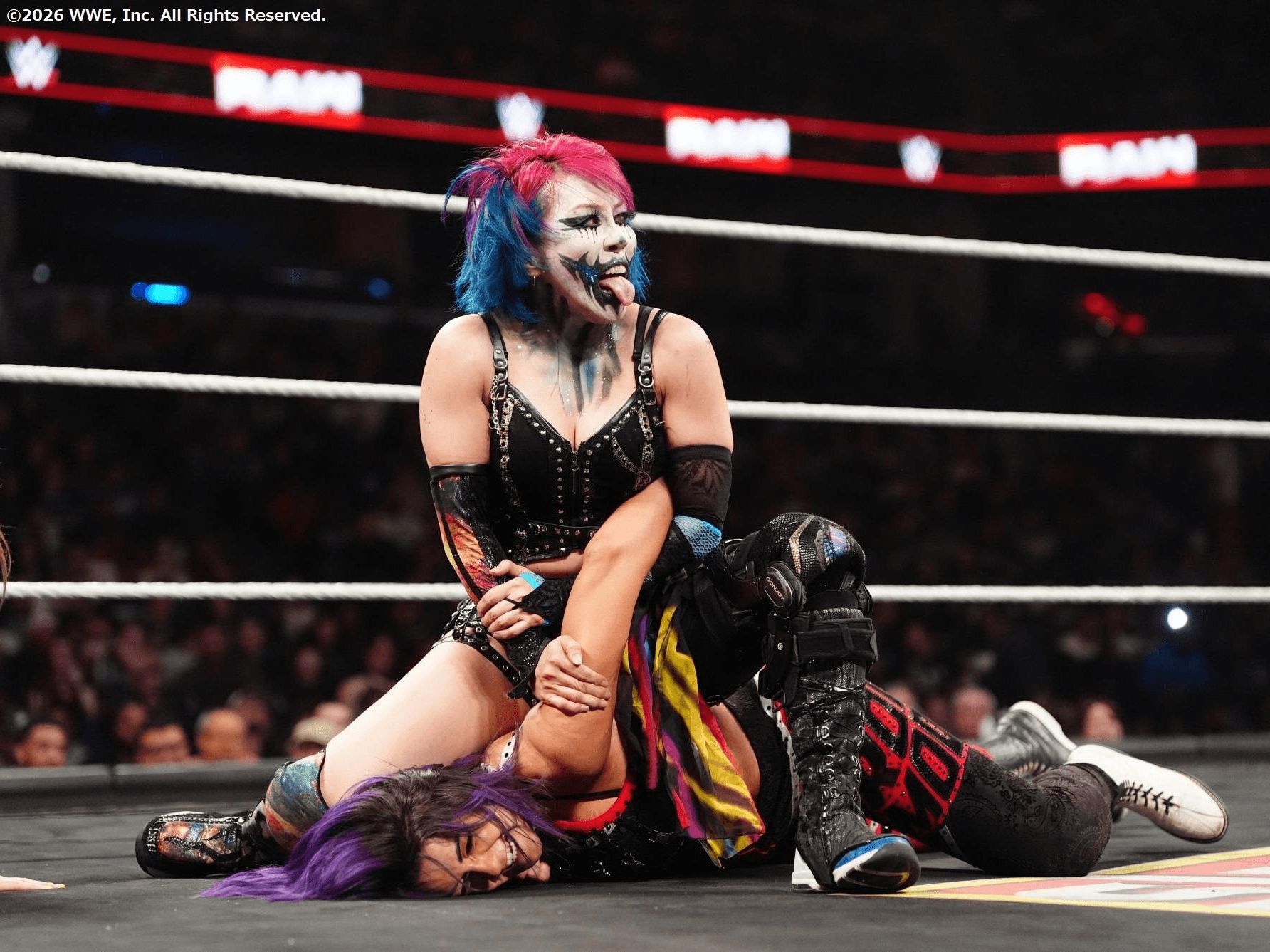 Asuka looking extremely sexo during her entrance, showing off her pits, and a single ass cheek.Bayley covered her breasts, a sign she is losing.