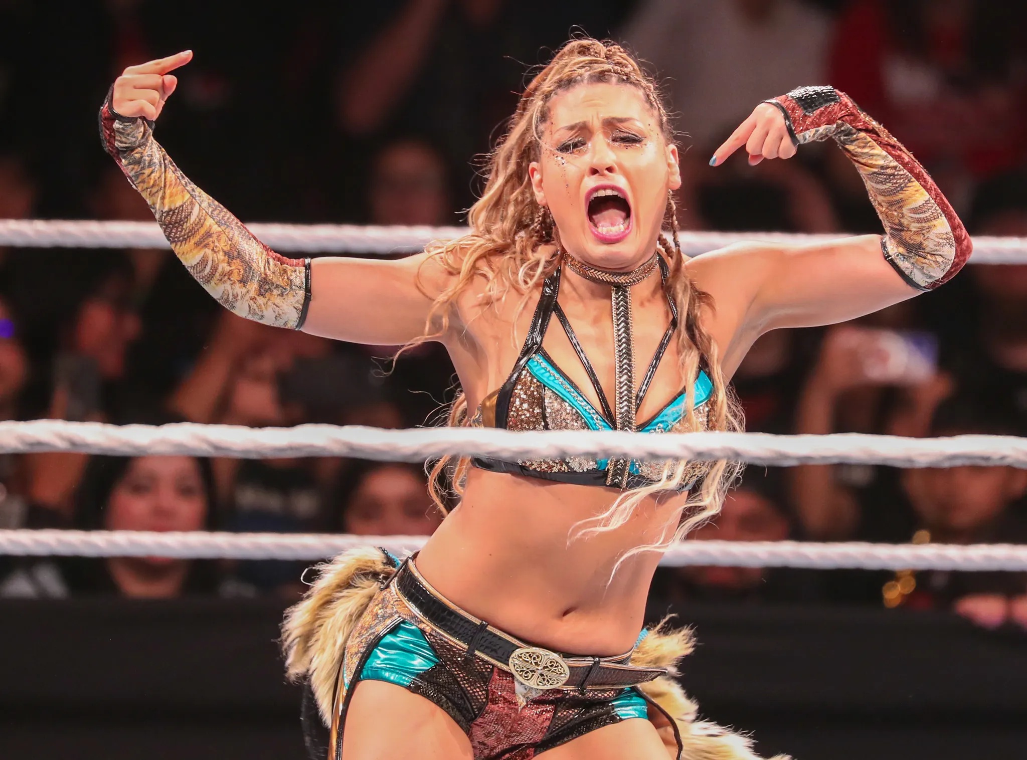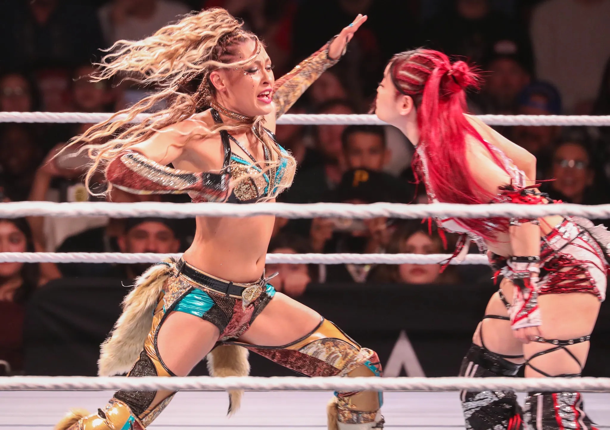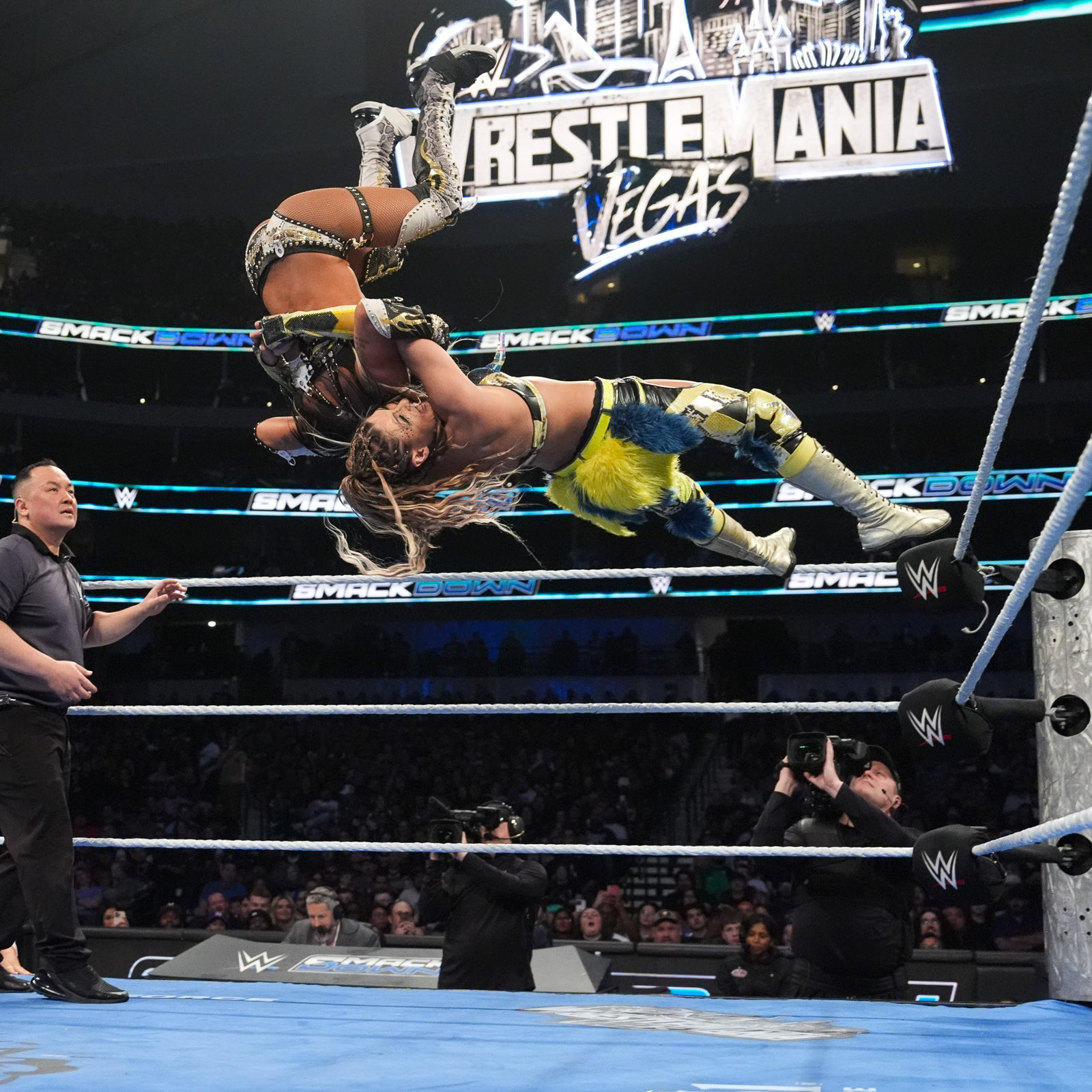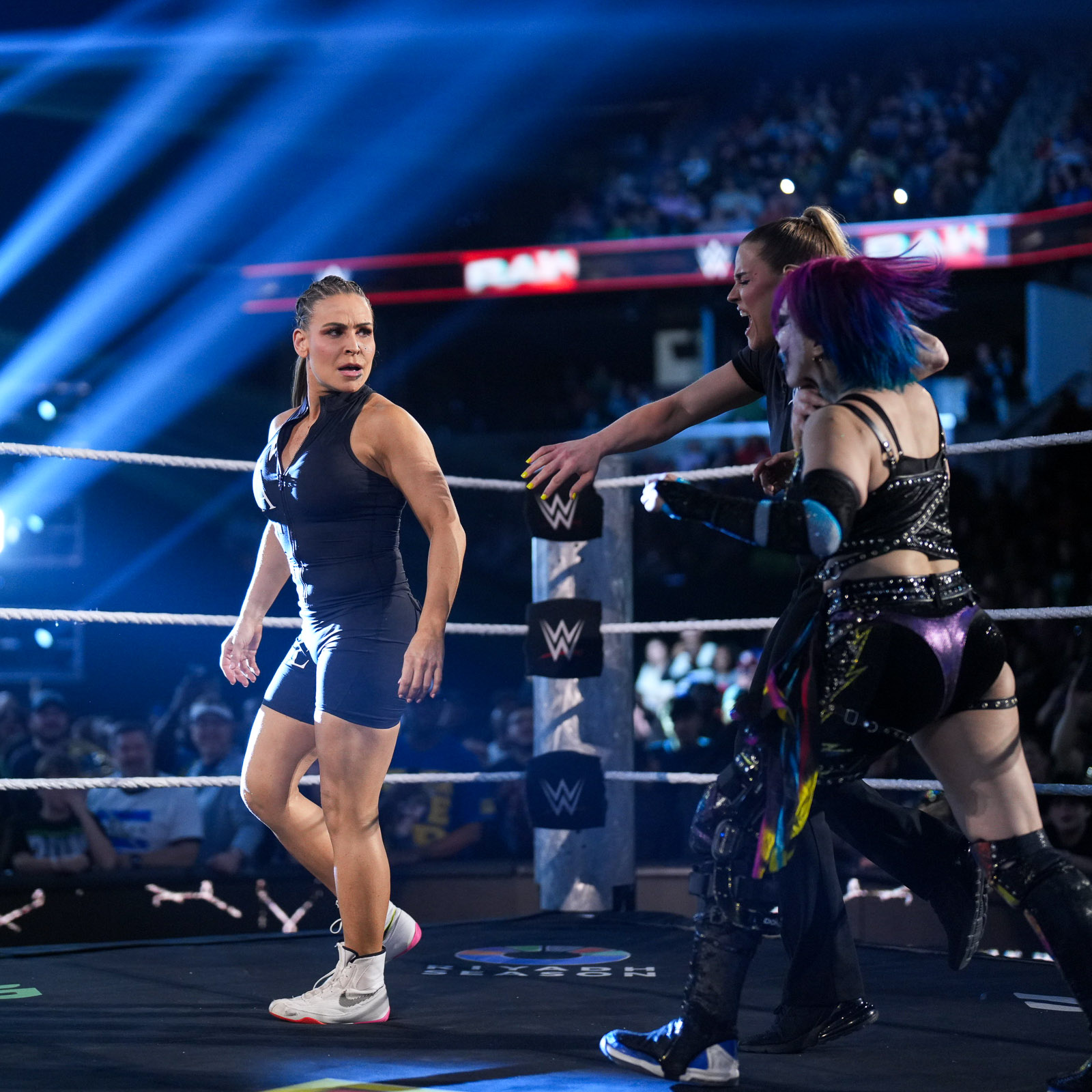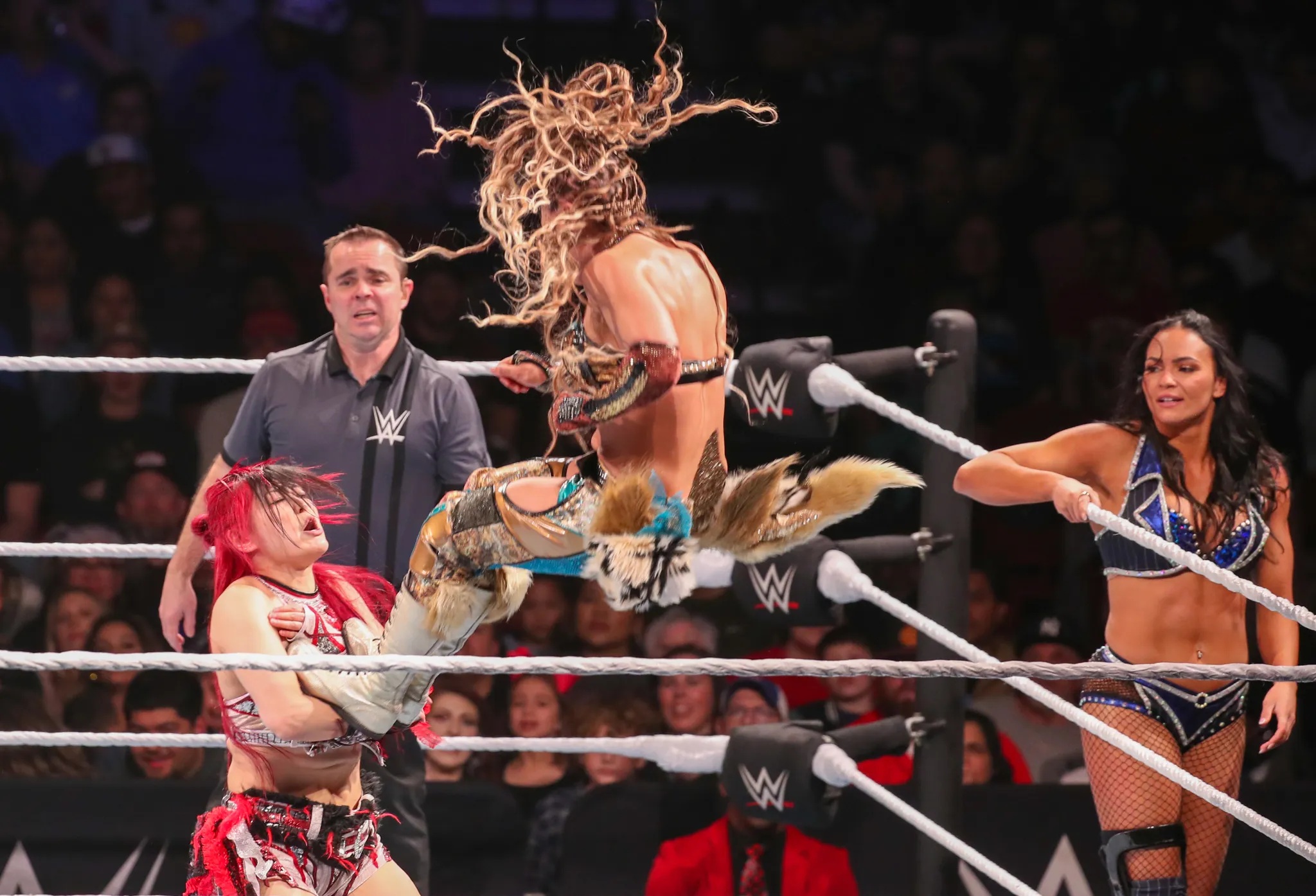 Asuka looking extremely sexo during her entrance, showing off her pits, and a single ass cheek.Bayley covered her breasts, a sign she is losing.