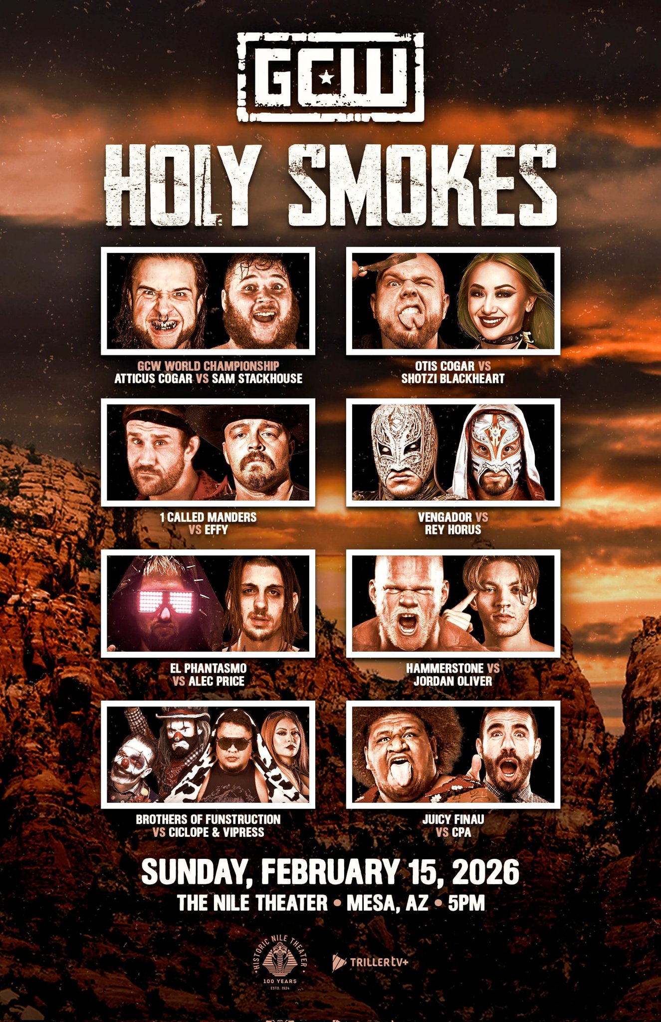Tonight at 7 ET>Rey Horus vs. Vengador>El Phantasmo vs. Alec Price>GCW World Title: Atticus Cogar (c) vs. Sam Stackhouse>Otis Cogar vs.Shotzi Blackheart>Hammerstone vs. Jordan Oliver>Brothers of Funstruction vs. Ciclope && Vipress>Juicy Finau vs. CPA>1 Called Manders vs. Effyhttps://www.youtube.com/watch?v=T3MxKr2YZ9Ehttps://www.youtube.com/watch?v=5mtlnDstTEY