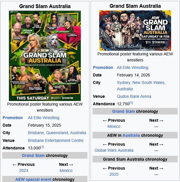 >>19898976Attendance: WrestleTix reported that 7,529 tickets had been distributed; arena is set up for 8,007. The arena has a capacity of 21,032 spectators when configured for concerts.https://www.pwtorch.com/site/2026/02/13/aew-grand-slam-australia-preview-2-14-announced-matches-location-ticket-sales-how-to-watch/