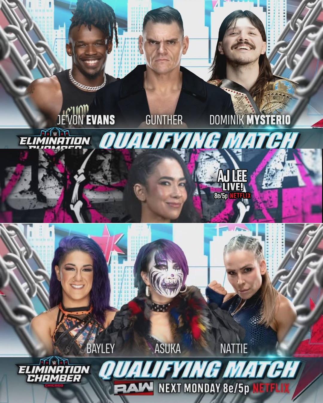 >Je'von Evans vs Gunther vs Dominik Mysterio Elimination Chamber Qualifying Match>Asuka vs Bayley vs Nattie Elimination Chamber Qualifying Match>AJ Lee and Becky Lynch to appear>CM Punk, Oba Femi, Stephanie Vaquer, Logan Paul advertised to appear