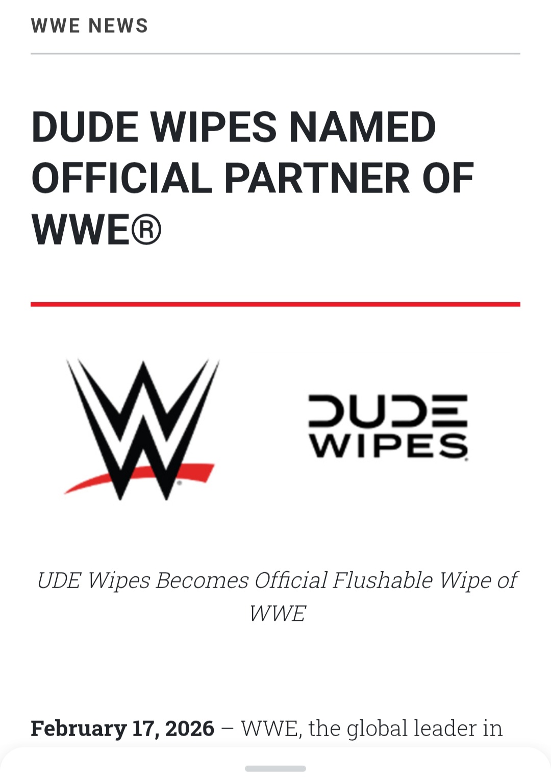 >Additionally, reigning Intercontinental Champion Dominik Mysterio, known for his rebellious in-ring persona and cultural resonance, will participate in a first-of-its-kind integration in which his signature gear will feature DUDE Wipes branding during every in-ring appearance on WWE programming, including Monday Night Raw and various PLEs. The integration debuted this past Monday on Raw, when Mysterio returned to in-ring action wearing his recognizable bandana rib cage t-shirt incorporated with DUDE Wipes branding.>“DUDE Wipes is a disruptive brand that speaks directly to our audience, and this partnership allows us to showcase that connection in a way only WWE can,” said Jesse Tomares, Vice President, Global Partnerships at WWE. “From high impact match sponsorships to unprecedented in ring integrations with Dominik Mysterio, this collaboration delivers a fresh, entertaining approach to brand storytelling at the biggest moments on our calendar.”>“As a lifelong WWE fan, this partnership hits differently for the brand. Us DUDE Wipes founders grew up watching WWE idolizing the superstars of our day. Getting the chance to partner with WWE and Dirty Dom and do something that’s never really been done before is surreal,” said Ryan Meegan, Co-Founder, CMO. “DUDE Wipes has always believed in meeting fans where they are in our own authentic way and we can't wait to encounter the amazing WWE fans all across the country. We promise to bring the fun and more importantly, the CLEAN with Dom in the best way possible!”
