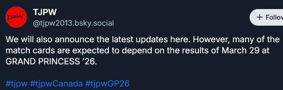 >[INCOMING]>We have a match announcement for GRAND PRINCESS '26 tomorrow!>Tuesday 9:00pm ET / 8:00pm CT / 6:00pm PT>Stay tuned to our social media!