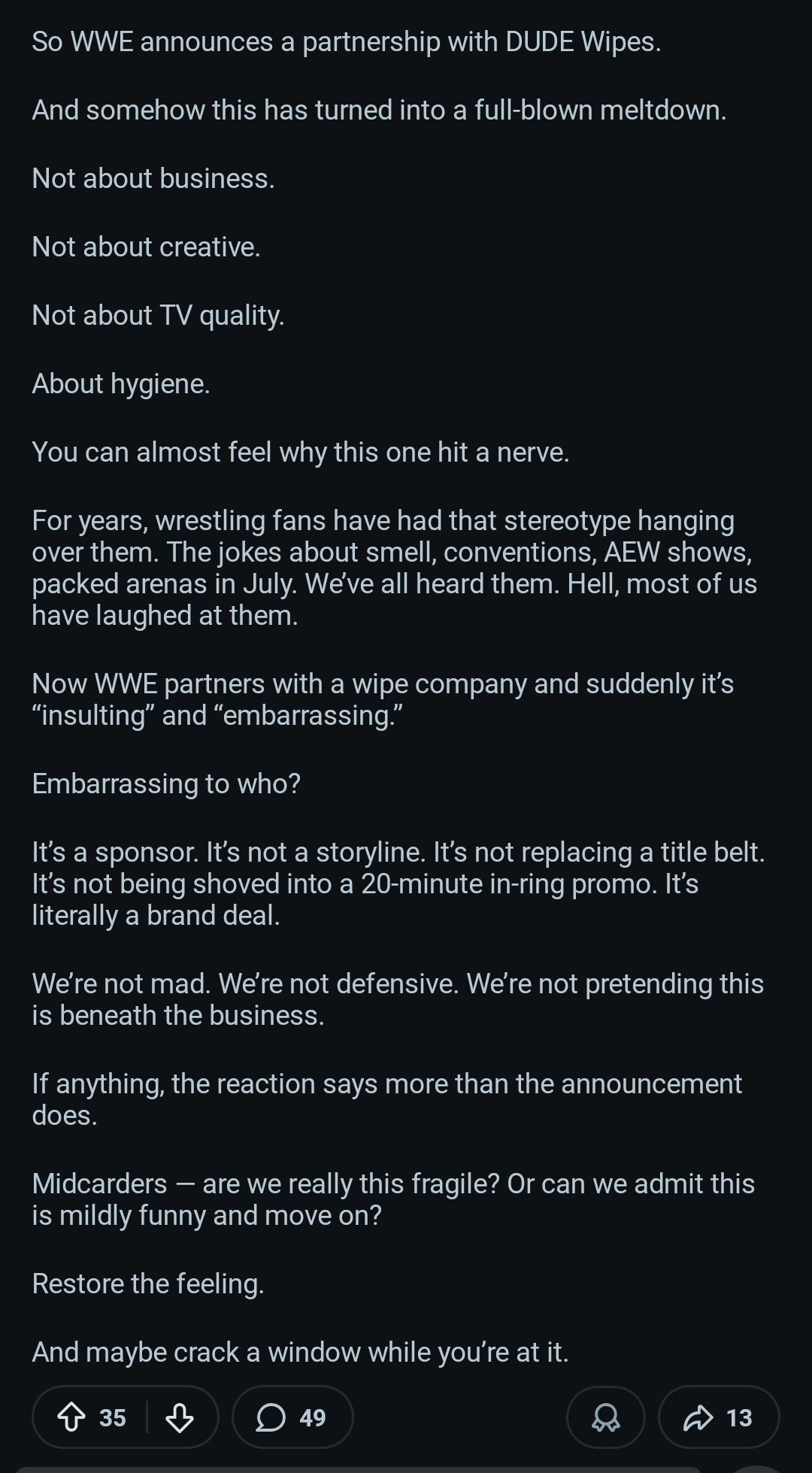 >dude wipes does business with WWE because they know their fans care about hygiene unlike AEW trannieswhats the issue?