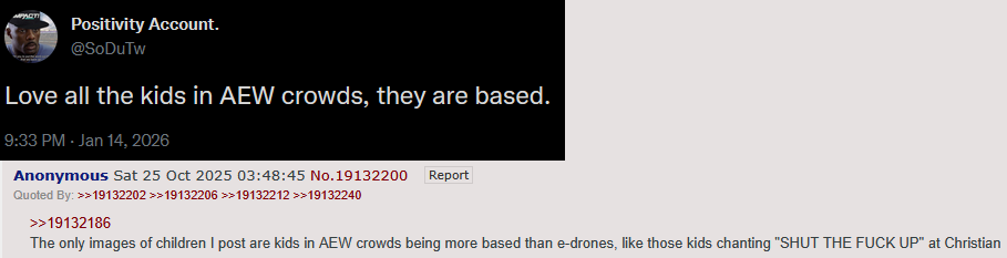 >>19913229>>19913241I always love when the singular AEW pedo sells for a bump in a thread he tried so hard to slide