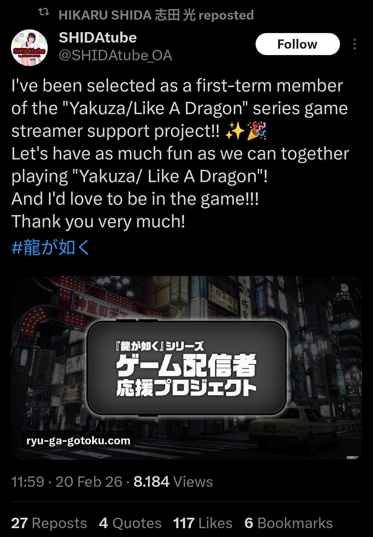 >>19926525She now got endorsed as an official streamer by Sega / RGG studio, so it's pretty much over.