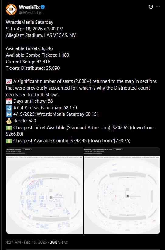 >Available Tickets: 6,546>Current Setup: 43,416>Total # of seats on map: 68,179WWE boom period finally over