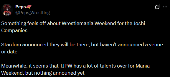 >>19927415February 23rd, "STARDOM in OKAYAMA 2026 Feb.", Okayama Convention Center, Okayama, 1:00PM JST (VOD)>HANAKO (-) & Waka Tsukiyama (-) vs Akira Kurogane (Mi Vida Loca) & Yuria Hime (STARS)>Lady C (God's Eye) vs Maki Itoh (Itoh Respect Army) vs Ruaka (H.A.T.E.)>Hanan & Momo Kohgo (STARS) vs India Sioux (CMLL) & Tabata (CMLL)>Maika (-) & Rian (-) vs Hazuki (-) & Fuwa-chan (-)>Starlight Kid, AZM, Mei Seira & Miyu Amasaki (NEO GENESIS) & Saki Kashima (God's Eye) vs Natsupoi, Yuna Mizumori, Aya Sakura & Sayaka Kurara (COSMIC ANGELS) & Anne Kanaya (-)>Syuri, Ami Sohrei & Hina (God's Eye) vs Konami, Natsuko Tora & Rina (H.A.T.E.)February 23rd, [Inaba Sisters' Produce] "First Triumphant Return to their Hometown", Toyokawa City General Gymnasium, Aichi, 2:00PM JST>MIRAI (Michinoku Pro), Chikayo Nagashima (Freelance) & Yuu Yamagata (Freelance) vs Ranna Yagami (STARDOM/God's Eye), Yurika Oka (Sendai Girls) & CoCo (MYWAY)>Rest of card: https://prowrestlingjto.com/20260223s/February 27th, [NJPW] "The New Beginning USA", CURE Insurance Arena, Trenton, 8:00PM EST (PPV)>IWGP Women's Championship: Syuri (c) (STARDOM/God's Eye) vs Athena (AEW)>Rest of card: https://www.njpw1972.com/tornament/card/605104
