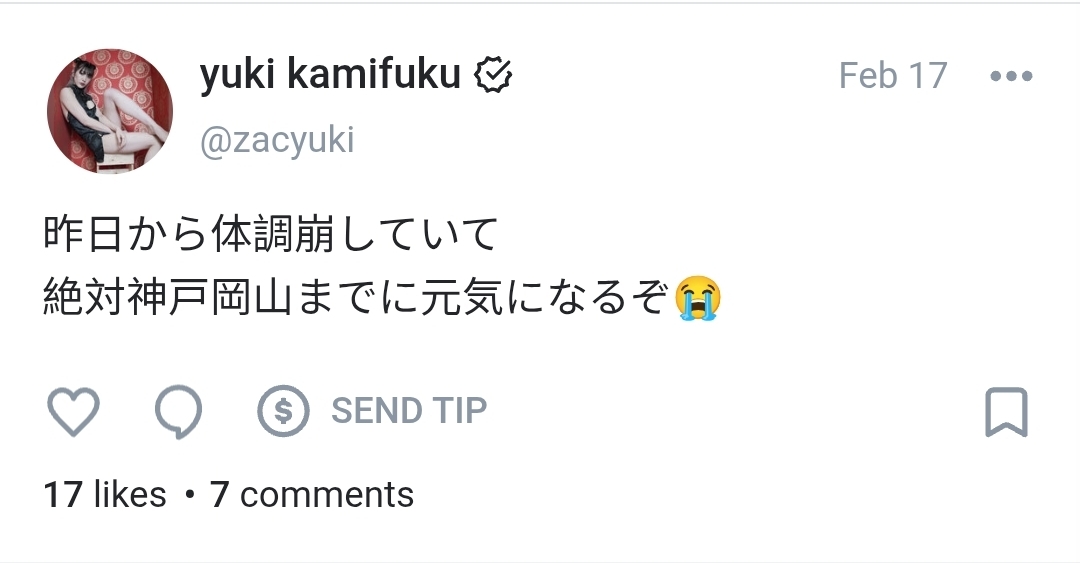 >Due to Yuki Kamifuku's poor health, she will be absent from today's and tomorrow's events.>We sincerely appreciate your understanding and cooperation.>As a result, the match card for today's Kobe event will be changed as follows.>Wakana Uehara vs Kira Summer>Rika Tatsumi & Mahiro Kiryu vs Yuki Aino & Pom Harajukurip donpen