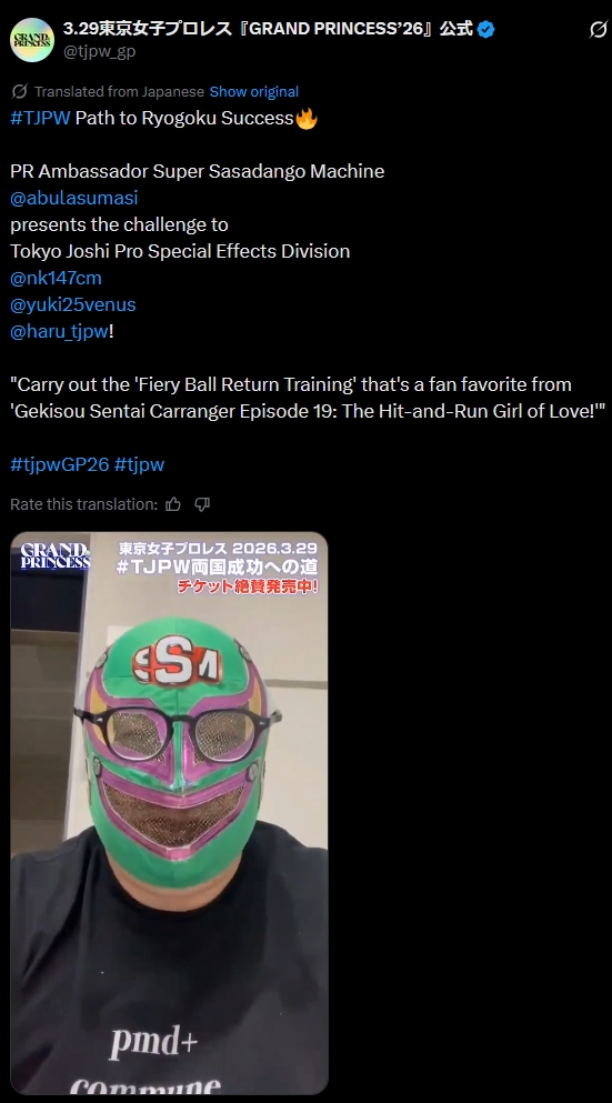 March schedule3.7 Prelude to GRAND PRINCESS '26 @ Shinkiba 1stRING (LIVE)[11:30 JST]3.15 GRAND PRINCESS '26: FATE IN RYOGOKU @ Ryogoku KFC Hall, Tokyo (LIVE)[12:30 JST]3.17 TJPW TEXAS STAMPEDE - Austin DAY1 @ Palmer Events Center Hall 1, Austin [19:00 CST]3.18 TJPW TEXAS STAMPEDE - Austin DAY2 @ Palmer Events Center Hall 1, Austin [18:00 CST]3.21 TJPW TEXAS STAMPEDE - Dallas @ University of Texas College Park Center, Arlington [15:00 CST]3.22 TJPW TEXAS STAMPEDE - Houston @ POST Houston [15:00 CST]3.29 GRAND PRINCESS '26 @ Ryogoku Kokugikan, Tokyo (LIVE)[14:00 JST]