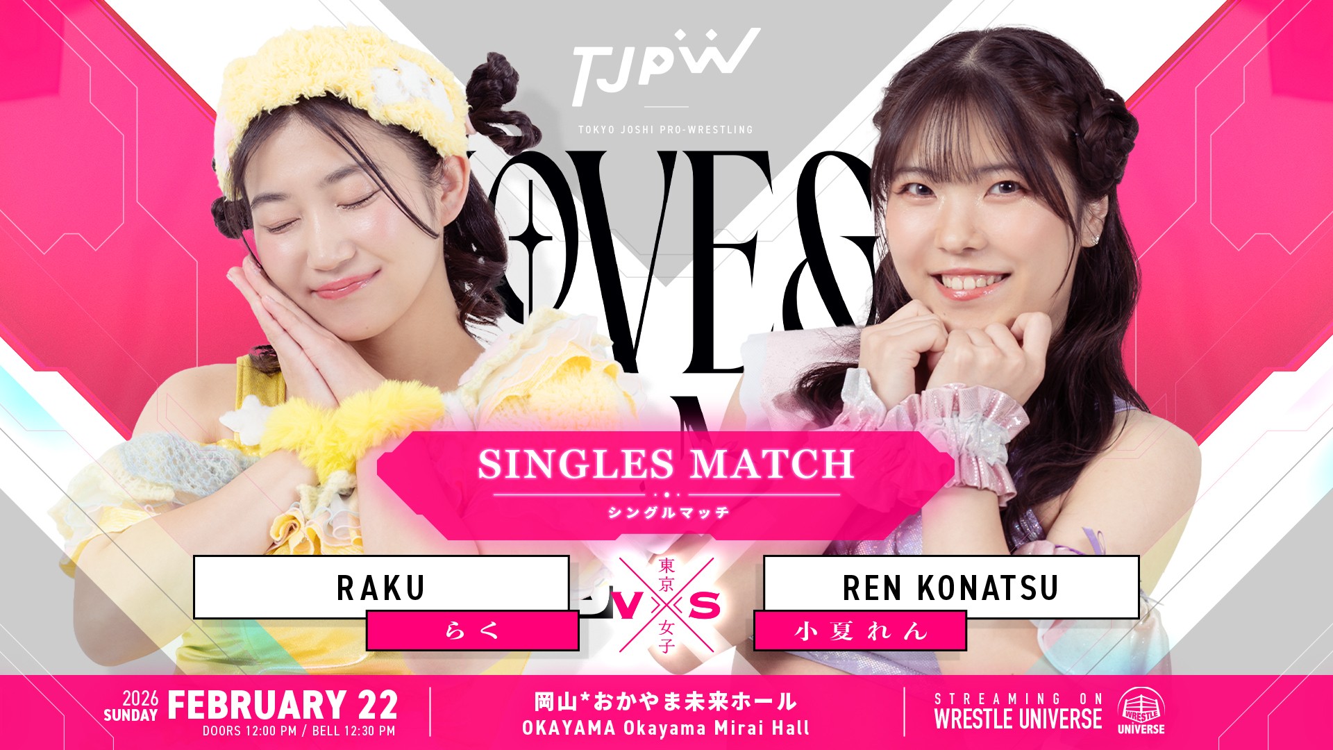 Watch on Wrestle Universe - 1,298 yen per month.https://www.wrestle-universe.com/enSchedule2.21 Final Curtain in KOBE Art Center @ Kobe Art Center, Hyogo (VOD)[12:30 JST]2.22 Love & Flame~The Burning Venus Returns~ @ Okayama Mirai Hall, Okayama (VOD)[12:30 JST]2.28 First Sparkle at Aioi Hall @ Kariya Industrial Promotion Center, Aichi (VOD)[12:30 JST]Previous>>19914449