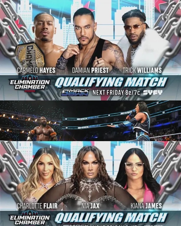 >SmackDown Introhttps://www.youtube.com/watch?v=gqveO__zwkU- Charlotte Flair vs. Nia Jax vs. Kianna James in a Triple Threat qualifier for the women’s Elimination Chamber match- Carmelo Hayes vs. Trick Williams vs. Damian Priest in a Triple Threat qualifier for the men’s Elimination Chamber match-Giulia vs Rhea Ripley for a non championship match, previously Iyo Sky vs Giulia>Last Week's Top 10 Moments:https://www.youtube.com/watch?v=ccZqGG0TxoI>Damian Priest vs. Aleister Black | Ambulance Matchhttps://www.youtube.com/watch?v=Gy5KKdr-QXo