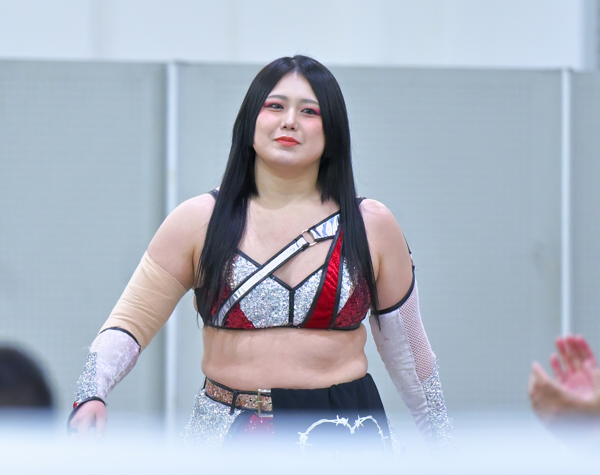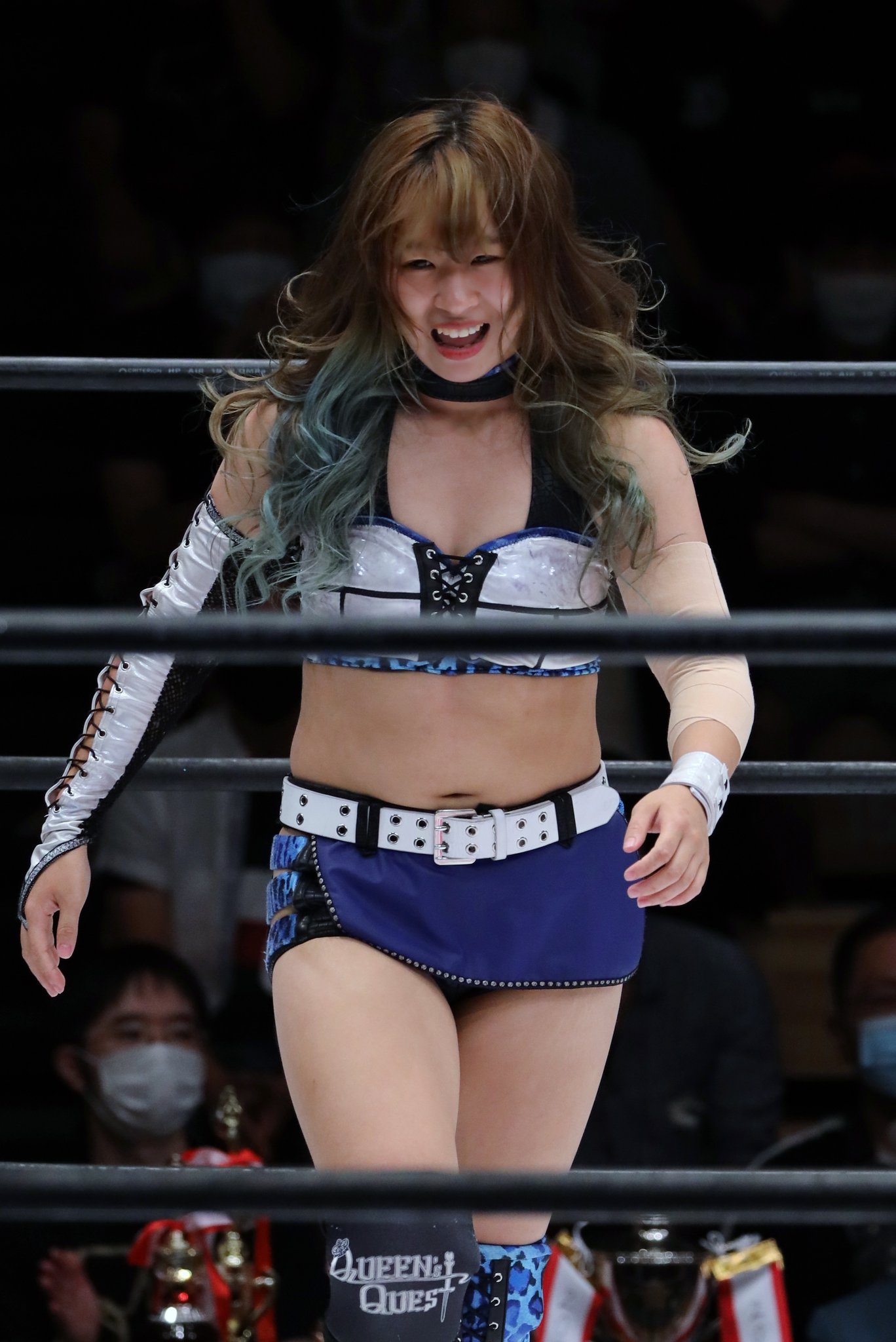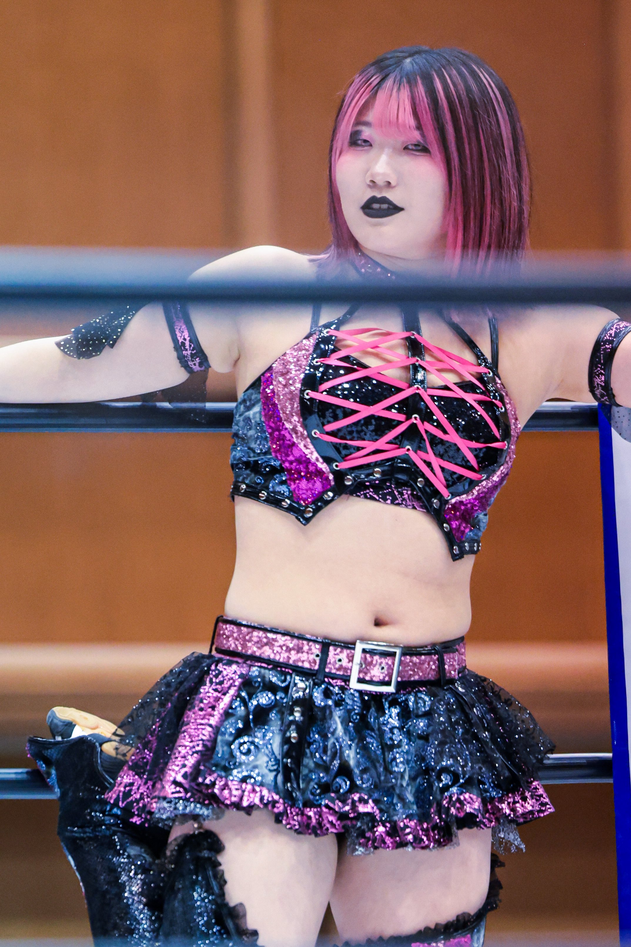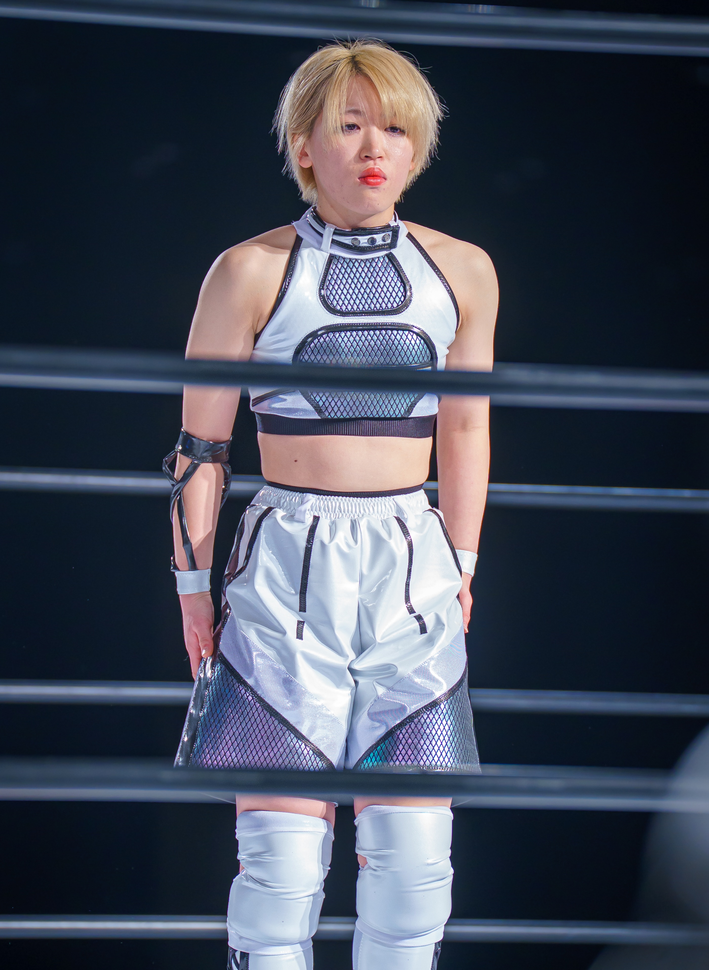 >Worn in STARDOM>Includes: Top, shorts, choker, arm bands, knee pad covers and stockings.I will be holding out for the blue gear.