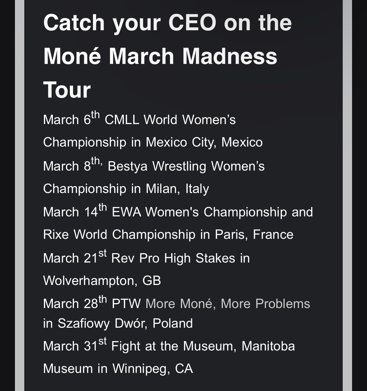 >>19957250>Persephone will take on Olympia at the February 27 CMLL event. The winner of the bout will take on Mercedes Mone for the CMLL World Women’s Championship on March 6.>Persephone teamed with Olympia on February 24 to defeat Tessa Blanchard & Zeuxis. The finish saw Olympia hit a fireman’s carry facebuster on Zeuxis for the win.>This will be Mercedes’ first match in CMLL since October 2025 when she defeated Persephone.
