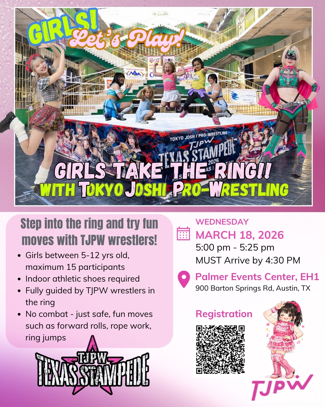 Watch on Wrestle Universe - 1,298 yen per month.https://www.wrestle-universe.com/enSchedule2.28 First Sparkle at Aioi Hall @ Kariya Industrial Promotion Center, Aichi (VOD)[12:30 JST]3.7 Prelude to GRAND PRINCESS '26 @ Shinkiba 1stRING (LIVE)[11:30 JST]3.15 GRAND PRINCESS '26: FATE IN RYOGOKU @ Ryogoku KFC Hall, Tokyo (LIVE)[12:30 JST]3.17 TJPW TEXAS STAMPEDE - Austin DAY1 @ Palmer Events Center Hall 1, Austin [19:00 CST]3.18 TJPW TEXAS STAMPEDE - Austin DAY2 @ Palmer Events Center Hall 1, Austin [18:00 CST]3.21 TJPW TEXAS STAMPEDE - Dallas @ University of Texas College Park Center, Arlington [15:00 CST]3.22 TJPW TEXAS STAMPEDE - Houston @ POST Houston [15:00 CST]3.29 GRAND PRINCESS '26 @ Ryogoku Kokugikan, Tokyo (LIVE)[14:00 JST]Previous>>19947240