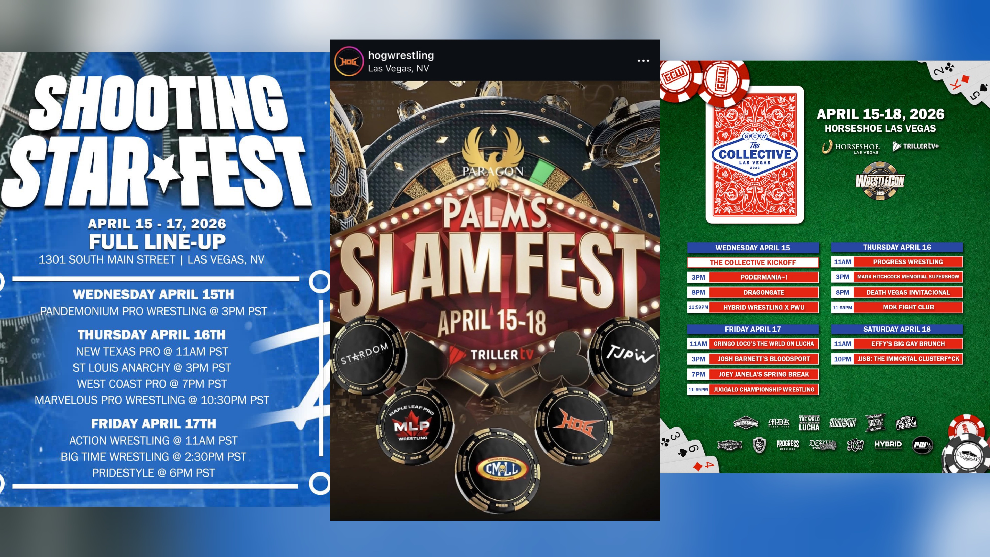 The Collective >gcw>wrestlecon>dragon gate>new japanSlamfest>cmll>tjpw>stardom >hogShooting star fest>marvelous >west coast pro >new texas pro>pridestyle