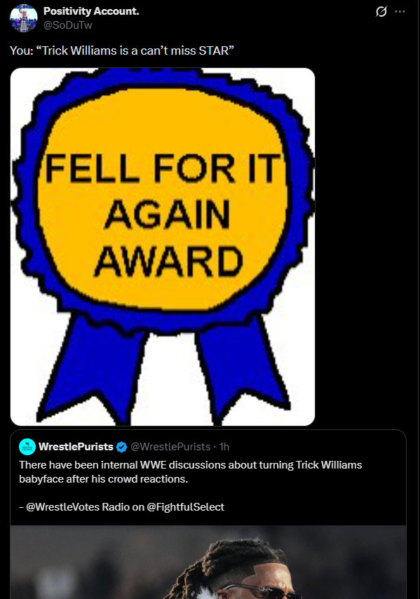 At least Trick actually was a very over babyface in NXT, so he would still be a good babyface on the main roster, but don't just turn him. Turn him when it's time, but let's enjoy heel Trick for a while.