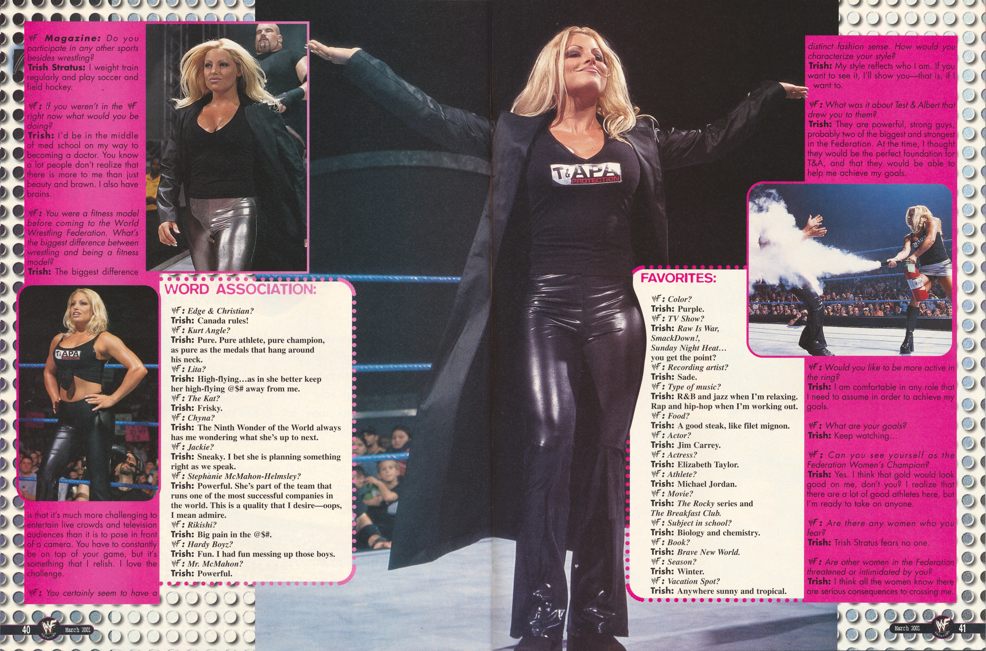 >Trish Stratus believes that everything happens for a reason, so when the World Wrestling Federation signed her to a contract last March, she reasoned that it was her opportunity to shine. Now, one year later, Trish’s star is burning brighter than ever and World Wrestling Federation Magazine’s 2000 Diva of the Year appears poised to re-define the very definition of the term “Diva.” Yet for all her success, Trish is far from content, and as every Federation fan knows, she’ll stop at nothing to achieve her goals.