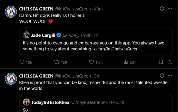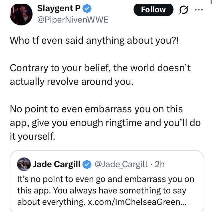 >Shayna>Natalya>Zelina>Chelsea>PiperWhat is it about these midcarders and jobbers that makes Jade seethe and chronically reply to them?