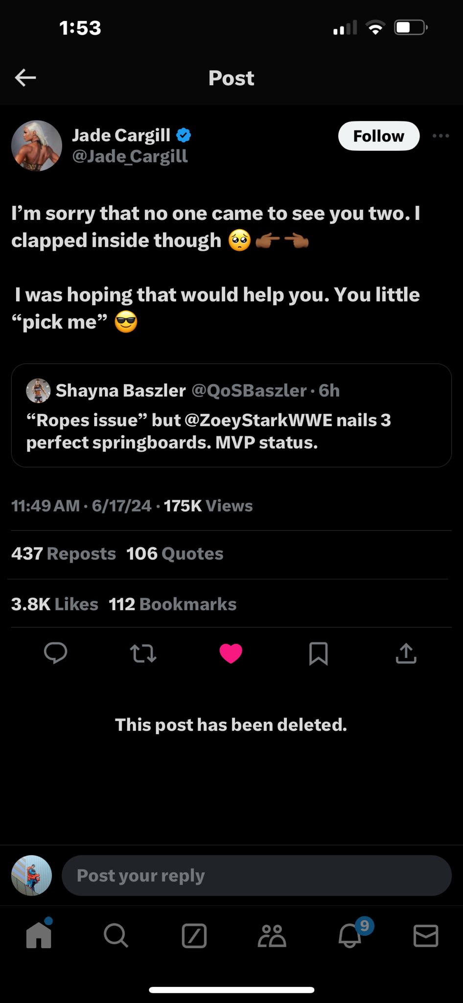 >>19992503>Jade isn't a wrestler at heart. She has a completely different mindset from any of the other wrestlers.yeah, shes not a mark like bayleno and so many other modern-day wrestlers