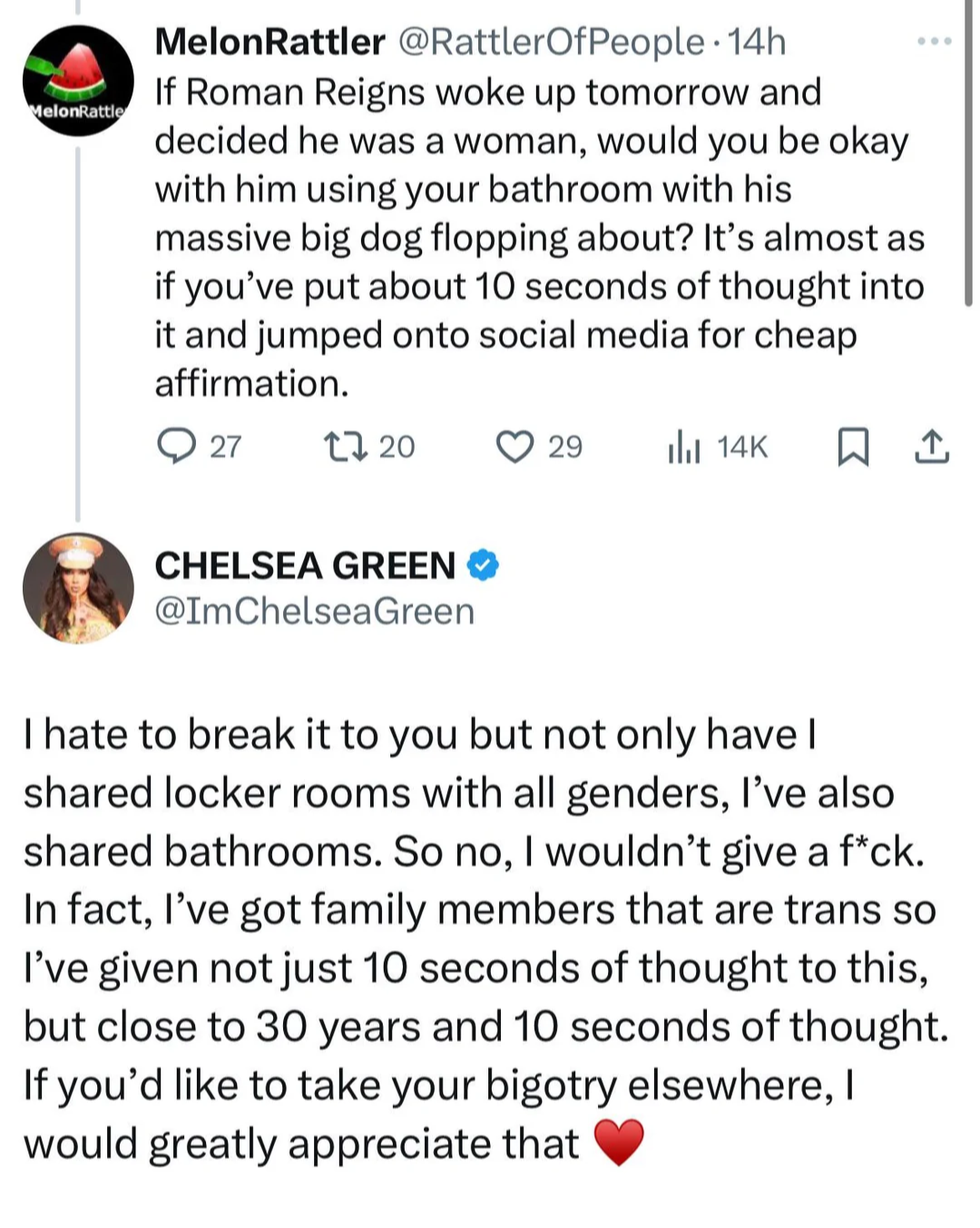 >>19992359>>19992381I’m in the minority, I guess, because I think this shit is great. Bitchy bullshit soundbytes on Twitter is EXACTLY what women do. It fits the brand of “womeme wrestling” perfectly. Now, when Roman fucking Reigns does it (like he did over the weekend), it’s beneath him and cringe as shit. But it’s perfect for the women.