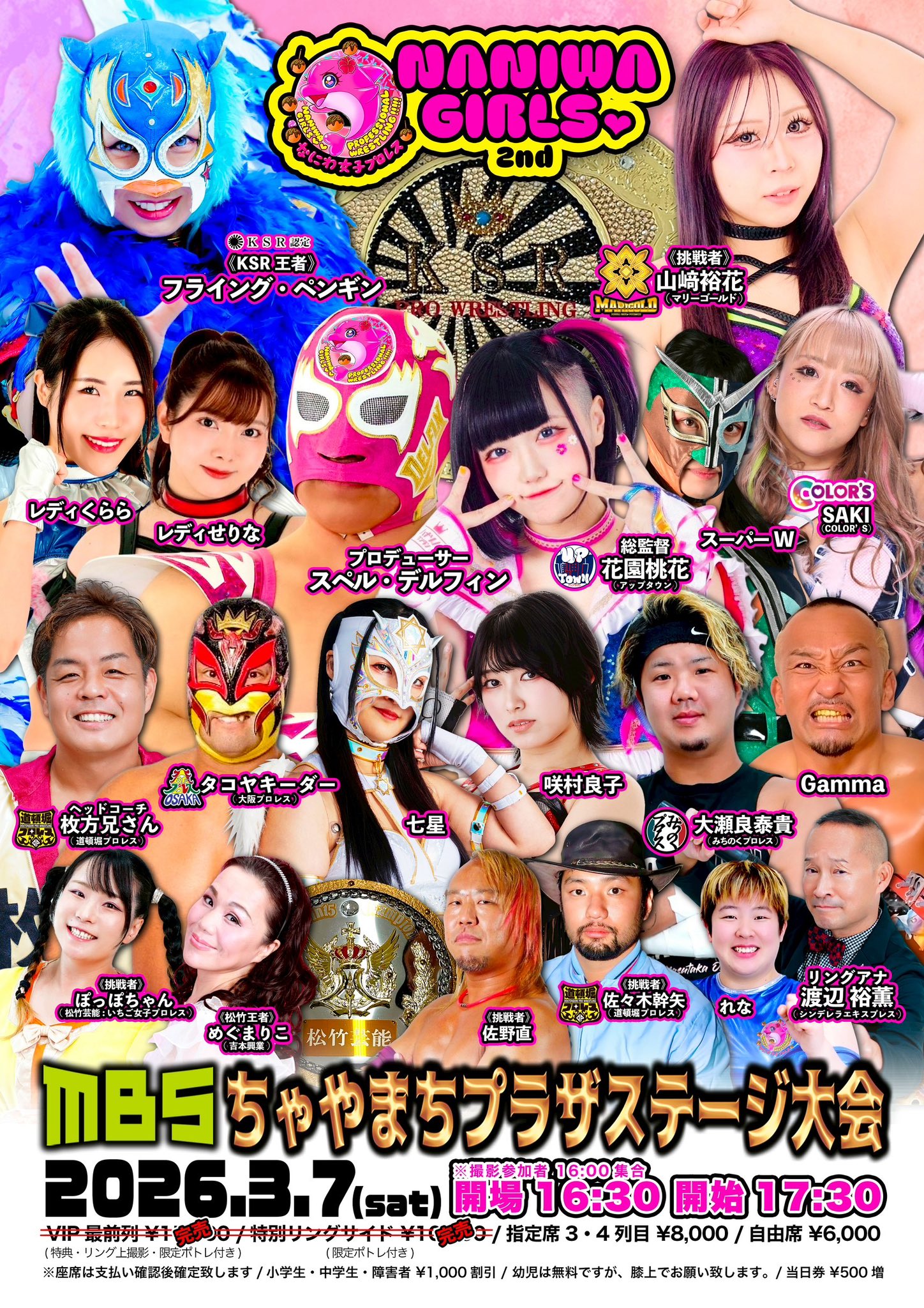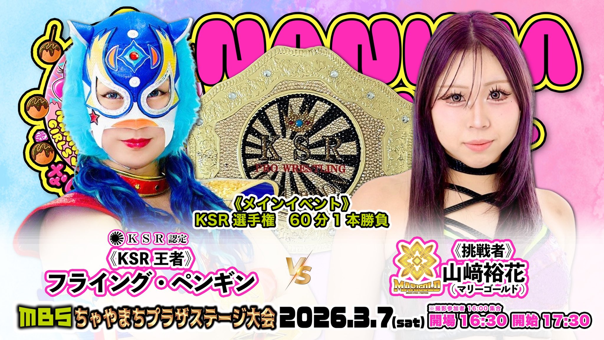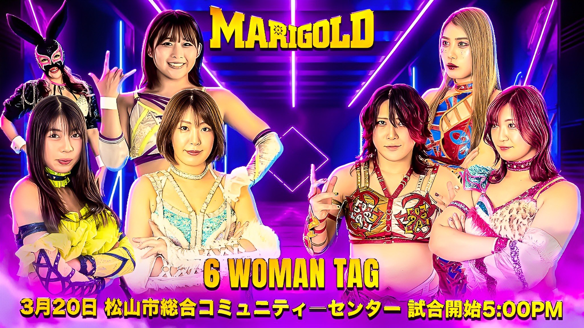 3/7 Naniwa Joshi @ MBS Chayamachi Plaza>KSR Championship: Flying Penguin (c) vs Yuuka Yamazaki >Ryoko Sakimura, Super Delfin, & Super W vs Nanase, Takoyakida, & Brother Hirakata>MARIGOLD Spring Victory Series 20263/8 Nagoya Chukyo Hall (1:00pm)>Mayu Iwatani, Victoria Yuzuki, & Komomo Minami vs Utami Hayashishita, Chika Goto, & Nagisa Tachibana>Trial of 7 Battles #1: SYOKO Koshino vs Miku Aono>Mai Sakurai, Natsumi Showzuki, & Erina Yamanaka vs Seri Yamaoka, Shinno, & Yuuka Yamazaki>Kouki Amarei & Hummingbird vs CHIAKI & Nagisa Nozaki>Nao Ishikawa & Megaton vs Misa Matsui & Rea Seto3/9 Universe Magic 2026 @ Shinjuku FACE (Live @ 7:00pm)>Universe Mix Magic 6-Woman: Marigold, Sendai Girls, & Marvelous vs Marigold, Sendai Girls, & Marvelous3/14 Korakuen (Live @ 11:30am)>3D Trios Championship: Mai Sakurai, Natsumi Showzuki, & Erina Yamanaka (c) vs Mayu Iwatani, Victoria Yuzuki, & Komomo Minami [1st champions, 1st defense]>FMW Independent World Junior Heavyweight Championship: Kushiro TOKYO JAPAN (c) vs Megaton 3/15 Chika Goto Homecoming @ Sunpearl Arakawa (1:00pm)3/20 Matsuyama City General Community Center (5:00pm)3/21 Osaka 176BOX (1:30pm)3/28 Shinjuku FACE (Live @ 12:00pm)3/29 Yasukuni Shrine Sumo Ring (12:00pm)4/3 INPEX Sakata Arena (6:30pm)4/4 Niigata City Higashi Ward Plaza (1:00pm)4/5 Wohlfahrt Toyama (1:00pm)4/11 Osaka 176BOX (1:00pm)4/12 Matsusaka City Heartful Mikumo (1:00pm)4/14 Shinjuku FACE (6:30pm)4/19 APA Hotel & Resort Sapporo (11:45am / 4:30pm)4/25 Korakuen (Live @ 11:30am)>Socialshttps://dsf-marigold.comhttps://x.com/DSF_Marigoldhttps://x.com/Marigold_Joshihttps://x.com/hashtag/pw_mghttps://www.instagram.com/dsf_marigold/https://www.youtube.com/@MARIGOLD-ho5nzWatch on Wrestle Universe (¥1,298 per month)https://www.wrestle-universe.com/en/marigold>Entrance musichttps://youtube.com/playlist?list=OLAK5uy_mz1s3xkNlFsMmySZlRdsEkxjj2isTVUEsPrevious >>19969593
